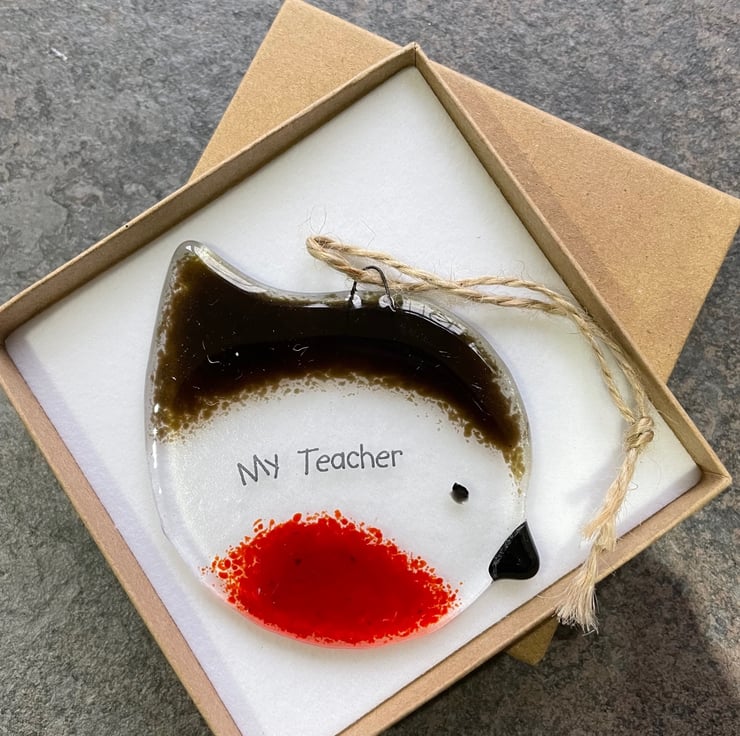 A beautiful handmade Robin made from fused glass and overprinted with My Teacher . This Robin will make a lovely gift for your teacher to add to their Christmas decorations and looks beautiful hanging from the tree. Should you order more than one item please message me so that I can combine postage costs.