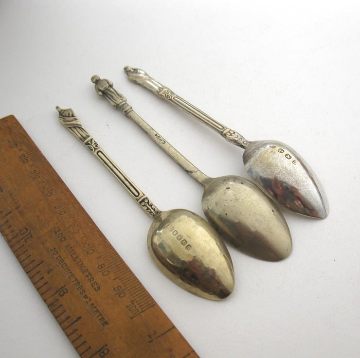 'Apostle' spoons have little bearded book-carrying robed figures on the terminals. Your granny probably has some in her cutlery drawer. They are approx. 11cm long. You will receive the three spoons shown in the photos - I don't do digital mockups. Please note the spoons I use are vintage (or possibly antique) so they do show signs of age and wear. If signs of age and wear bother you, please do look elsewhere for your handstamped cutlery; there are plenty of shops out there stamping on mint condition silverware. Personally I like things with a bit of character and history. These grumpy old guys have been around a bit... who knows how many cups of coffee they've stirred and how many Christmases they've spent being stuffy and correct... they are now done with the whole thing but they will still (grudgingly) stir your coffee for you.