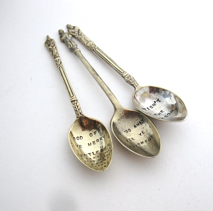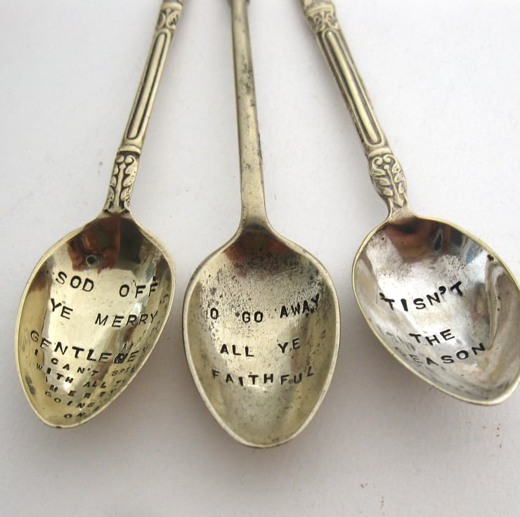 A set of THREE mismatched vintage Apostle spoons with alternative festive messages: SOD OFF YE MERRY GENTLEMEN (I can't spell with all this merry going on); 'TISN'T THE SEASON; and O GO AWAY ALL YE FAITHFUL. An ideal gift for anyone you know who groans whenever the carolsingers ring the bell!