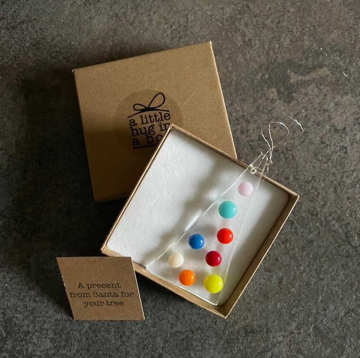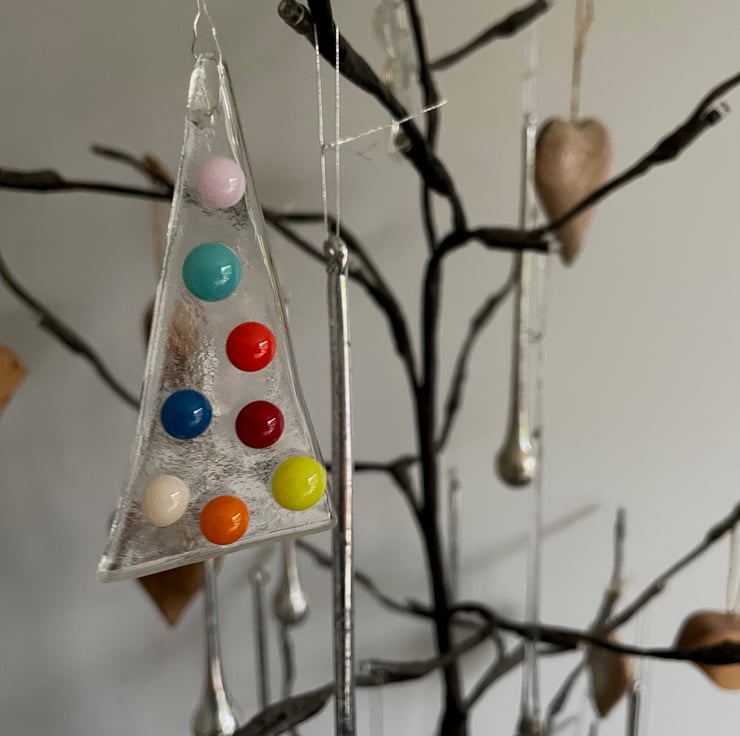 A beautiful handmade fused glass Christmas tree decoration in the shape of a tree. The tree has raised multi coloured glass dots on and measures approximately 5cm. The dots vary from piece to piece in colour and as each is handmade they may vary from the one in the photograph. Should you order more than one item please message me so that I can combine postage costs.