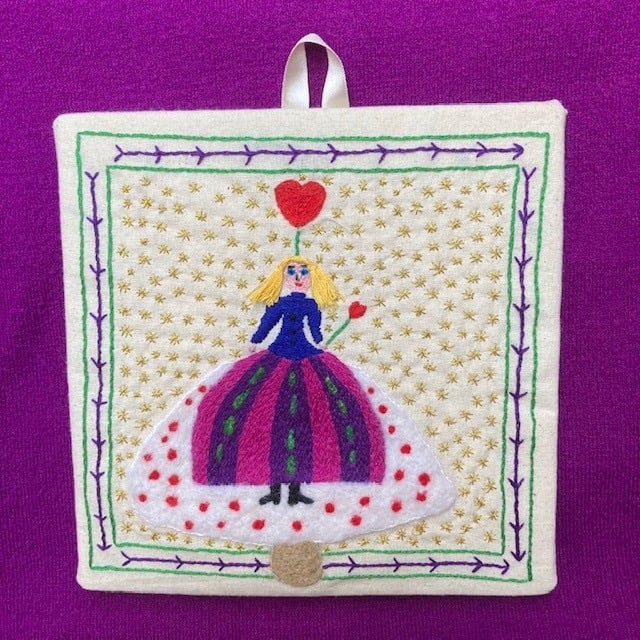 This whimsical fairy is waiting to put a "love spell" on someone with her magic heart wand. The fairy & her beautiful dress have been hand embroidered. She is standing on a spotty toadstool which has been needle felted. Surrounding her are many embroidered twinkly, golden stars. The piece of art has been created on natural linen & mounted on art board. It measures 18cm x 18 cm. There is a small cream ribbon loop attached to the back of the picture to hang it up with. The picture has been backed with dark grey cotton.