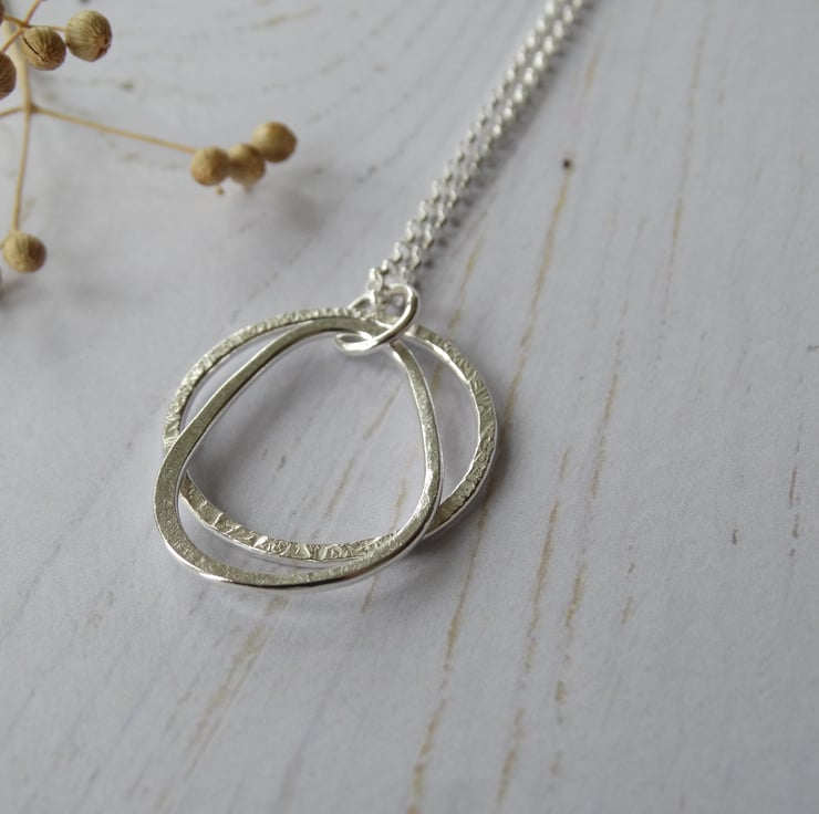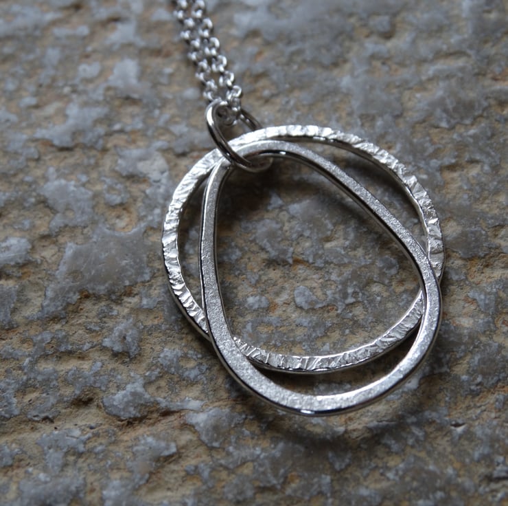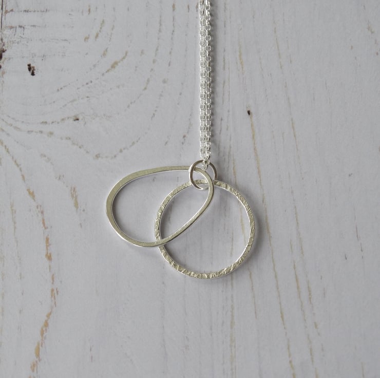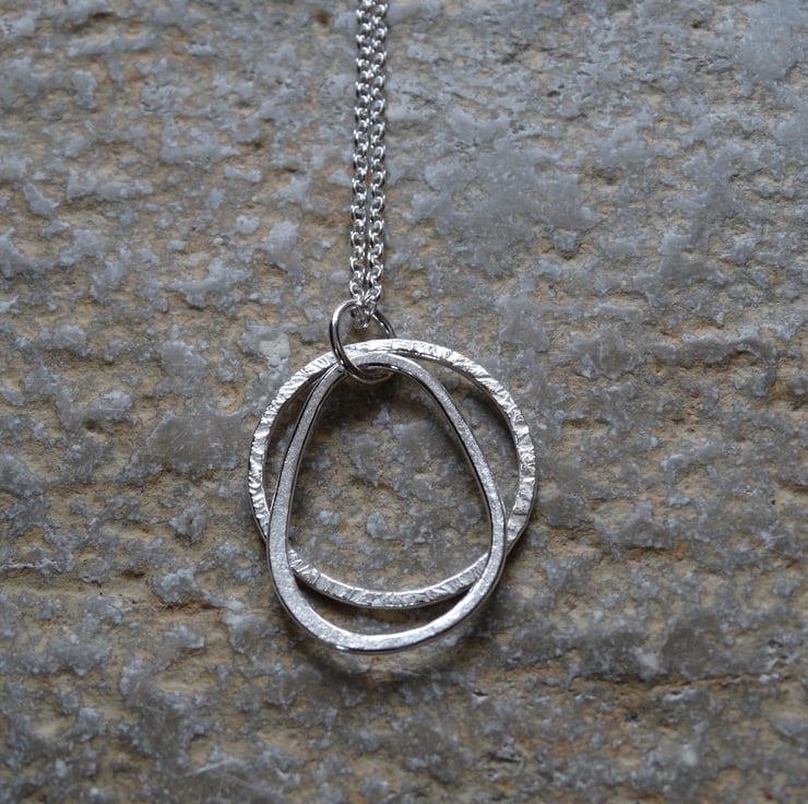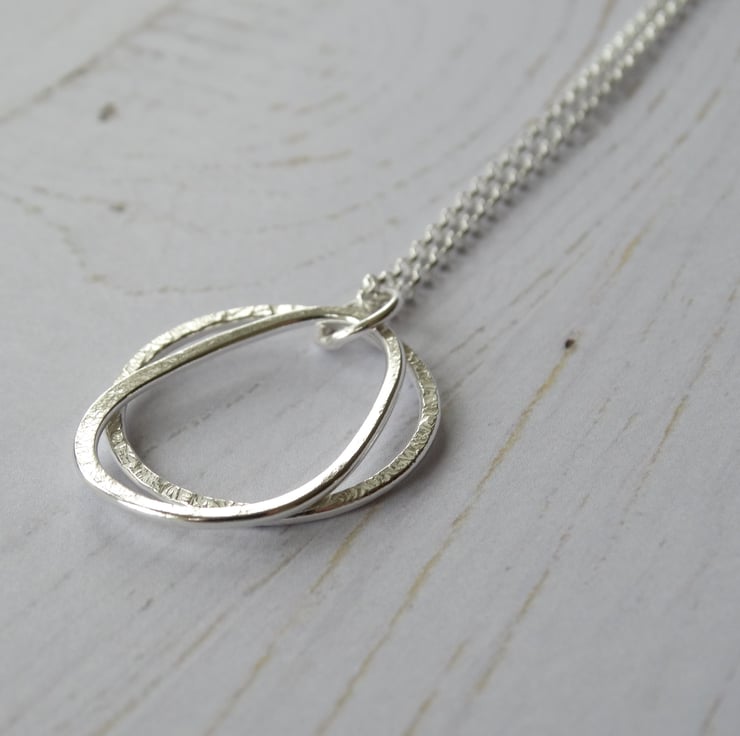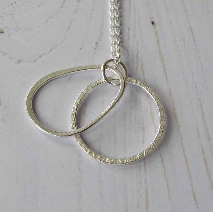 A simple and elegant handmade sterling silver pendant, made from recycled sterling silver. The hoop and pebble shape have been formed by hand and textured using two different methods for contrast and to catch the light. They hang together on a 24 inch recycled sterling silver belcher chain (please message me if you would prefer a shorter length chain.)