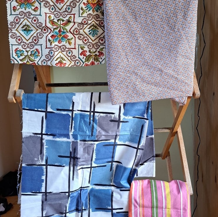 Four pieces of genuine vintage fabric of different size, texture and design.