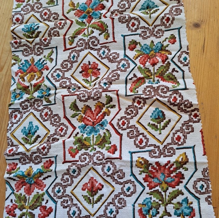 1 A piece of bark cloth with a geometric floral design on a beige background 46cm x 28cm