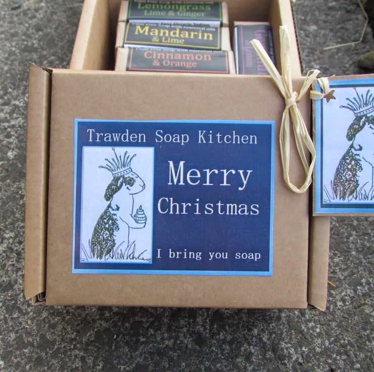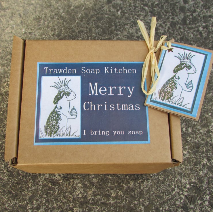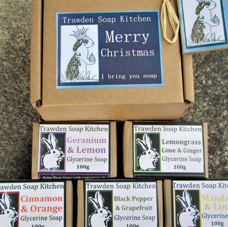 This set of 5 soaps is my best seller all year round on Folksy. Its always nice to give packaging a festive feel. Artwork of Mouseypie,( I bring you soap...) courtesy of Liz Haley