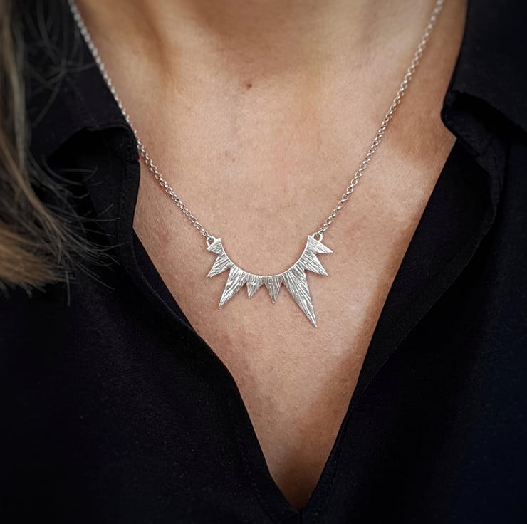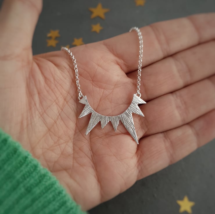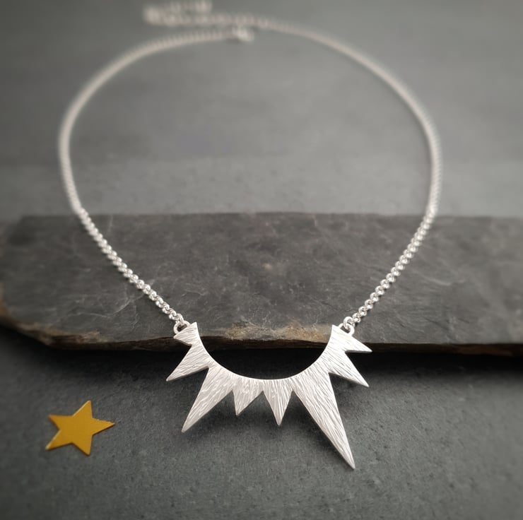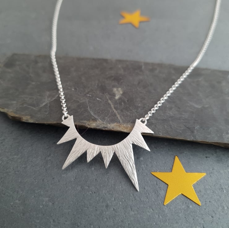 Each shimmering star is firstly pierced by hand from sterling silver sheet and then textured and polished before the chain is soldered in place. When that's done the whole piece goes into a barrel for a couple of hours of final polishing to give it a lovely shiny and smooth finish.