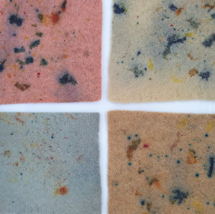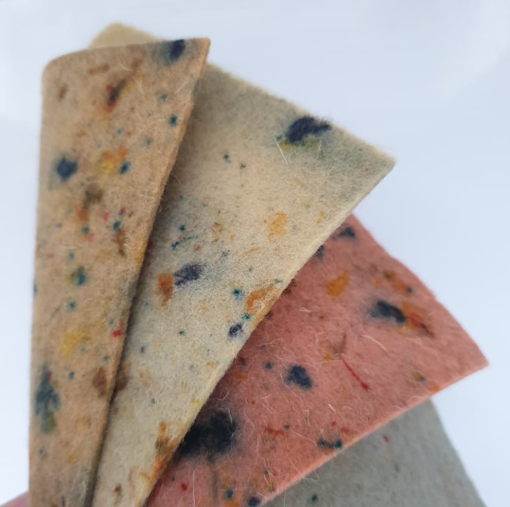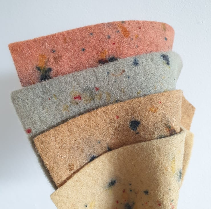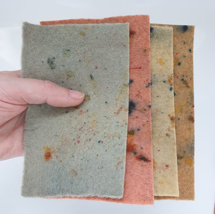 100% wool felt sheets in naturally dyed autumnal tones made from alder cones, dyer's chamomile, madder and indigo, with speckles from scabiosa, coreopsis, hollyhock and madder.