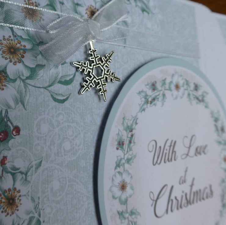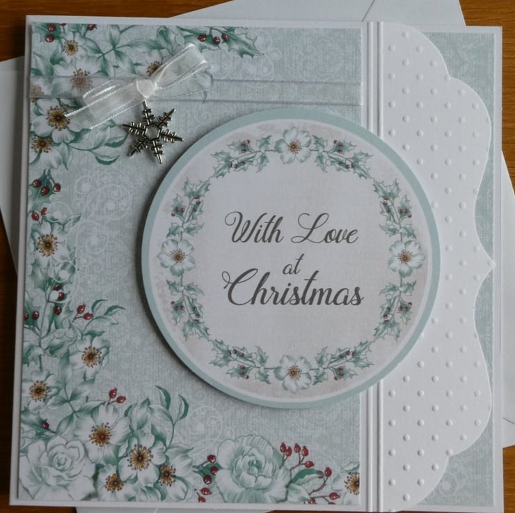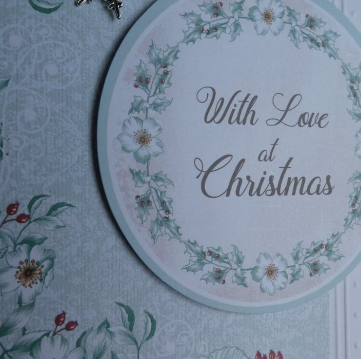 This elegant Christmas card has a circular printed topper with the words With Love at Christmas inside a wreath of christmas roses and holly.