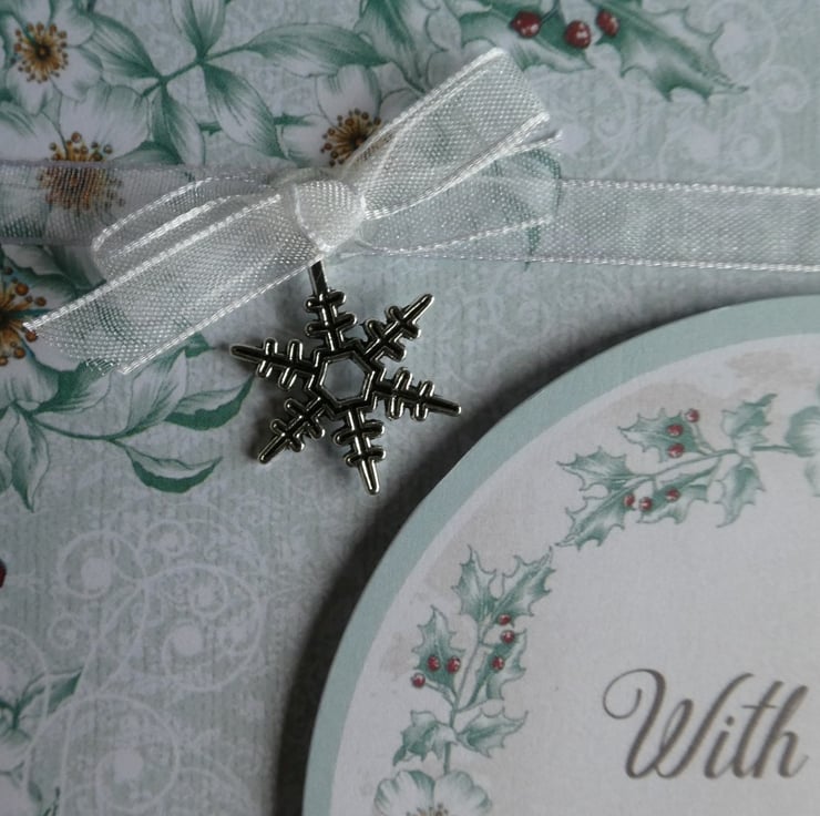 A length of white organza ribbon has been added across the top with a silver coloured metal snowflake charm tied with a white organza bow.