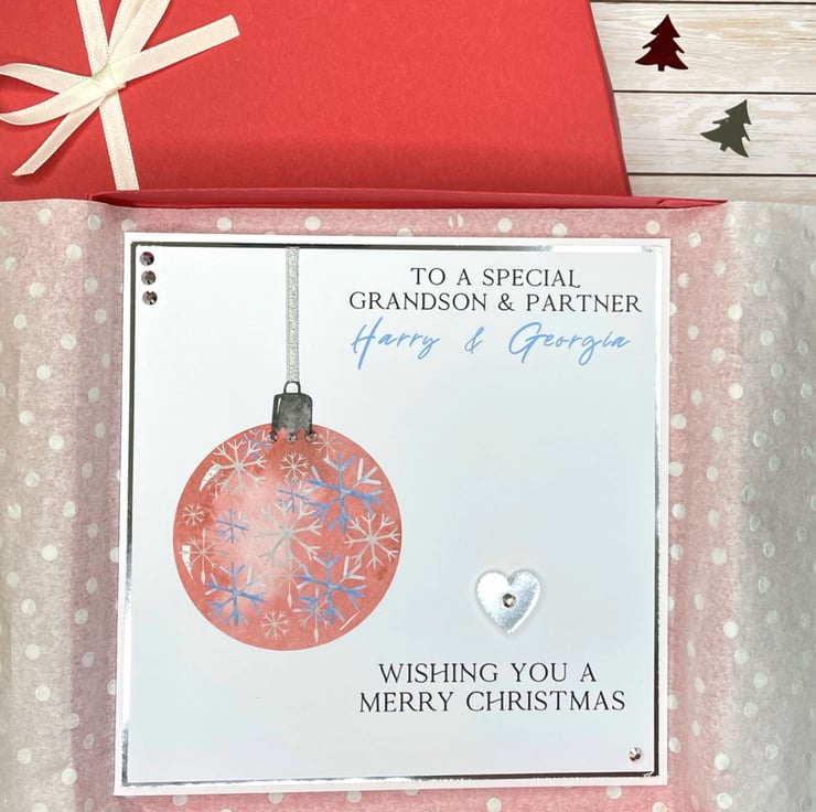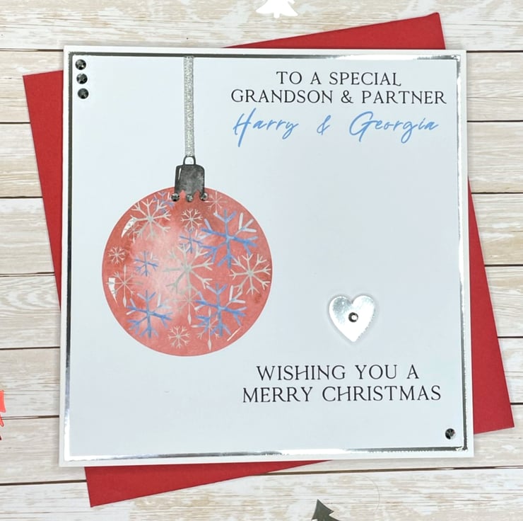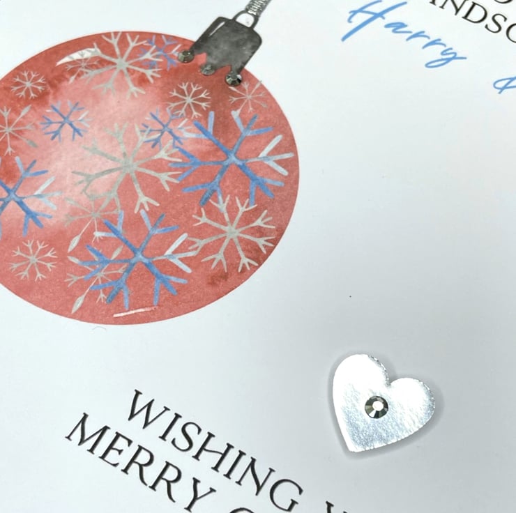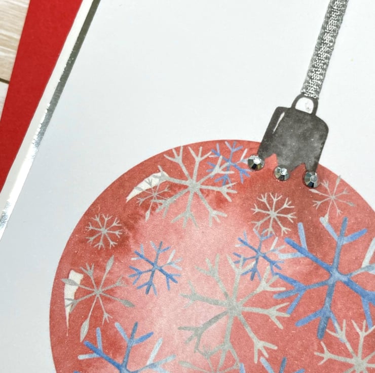 A personalised, handmade Christmas card featuring an image of a red bauble with a snowflake pattern.