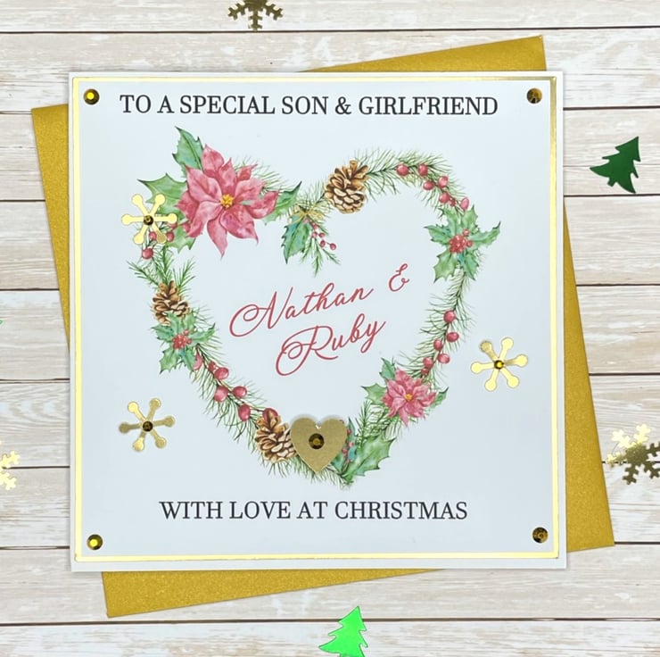 A personalised, handmade Christmas card featuring a heart shaped Xmas wreath.