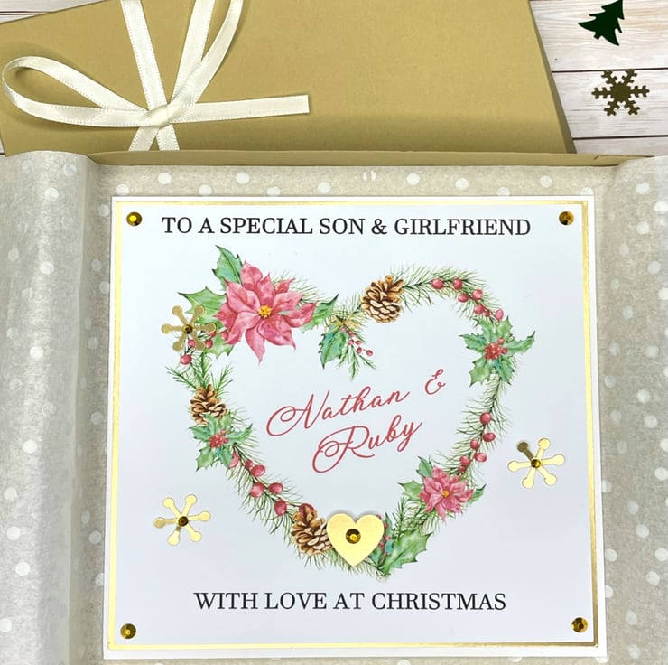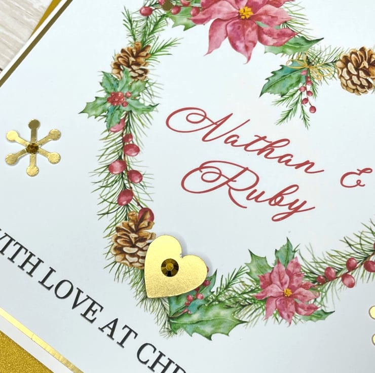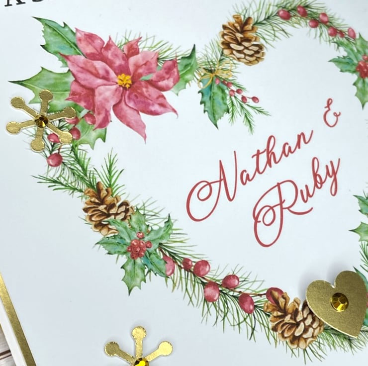 A personalised, handmade Christmas card featuring a heart shaped Xmas wreath.