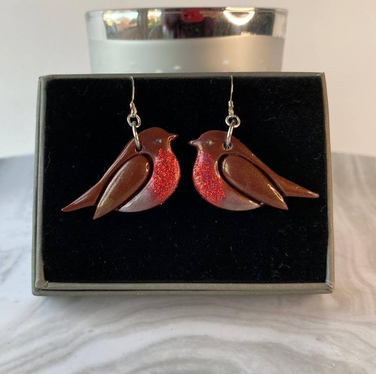 I custom mix a blend of warm chocolate brown polymer clays to create the robins and then a paint on red glitter and a shimmery white for the body details. Once baked and sanded I add a topcoat to seal and protect the earrings.