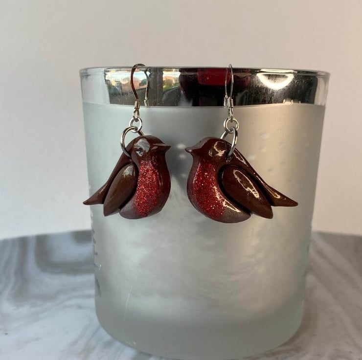 Robin earrings with red glitter polymer clay and resin on sterling silver ear wires. Handmade polymer clay earrings with hand painted details and fine red glitter added to transform these earrings into something special this festive season. Sealed with a clear topcoat for a smooth and glossy finish.