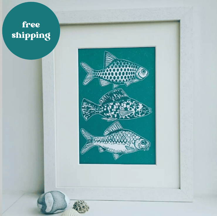 Fish Original linocut print green , Free Post and packaging