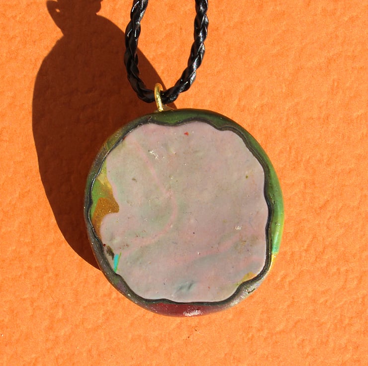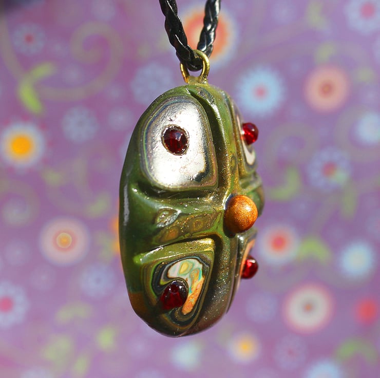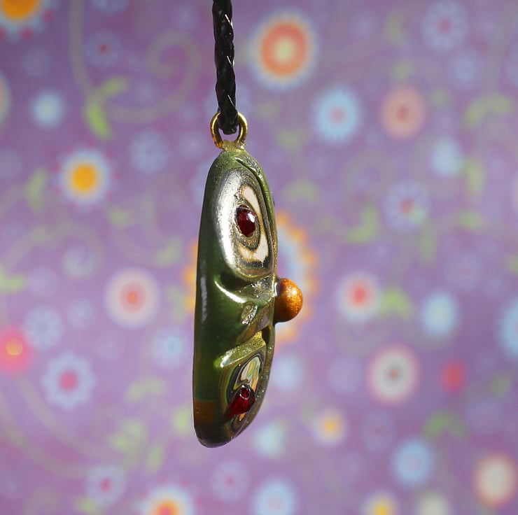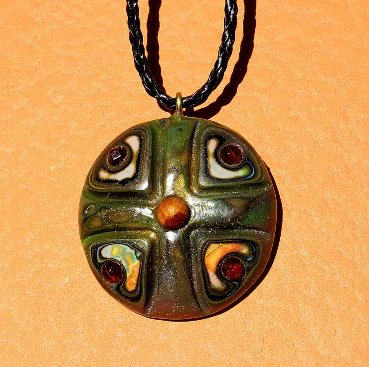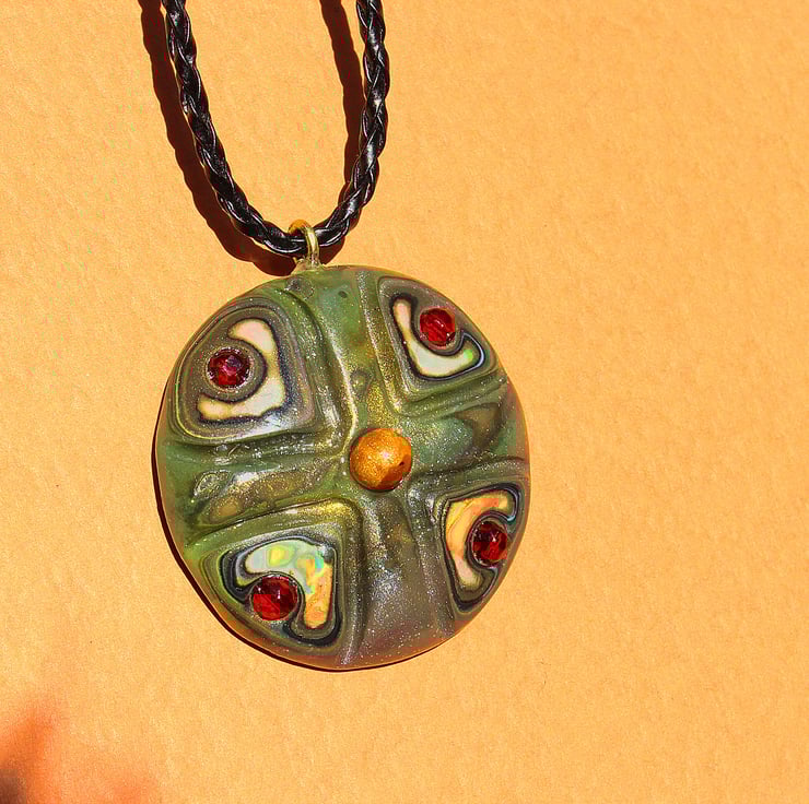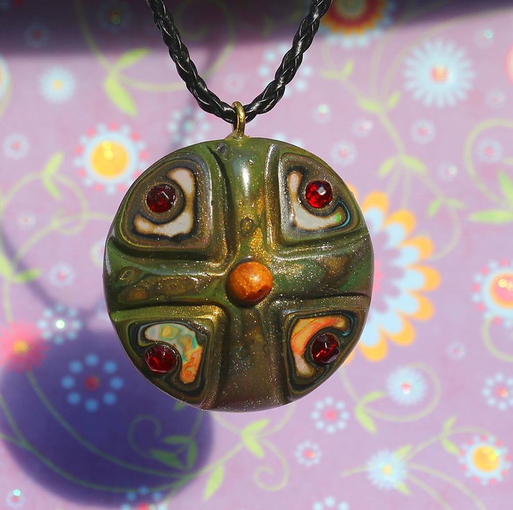 A striking looking pendant, in authentic looking Olden Days style, made by myself from polymer clay and sparkling ruby glass beads. The hook is of finest brass. The pendant is 4.5cm across and hung on fancy black string cord of variable length (17" to 21").
