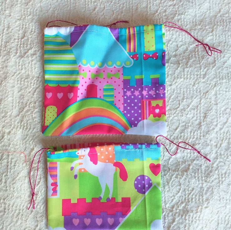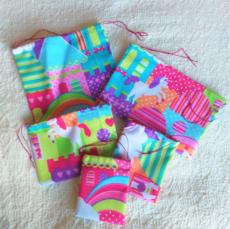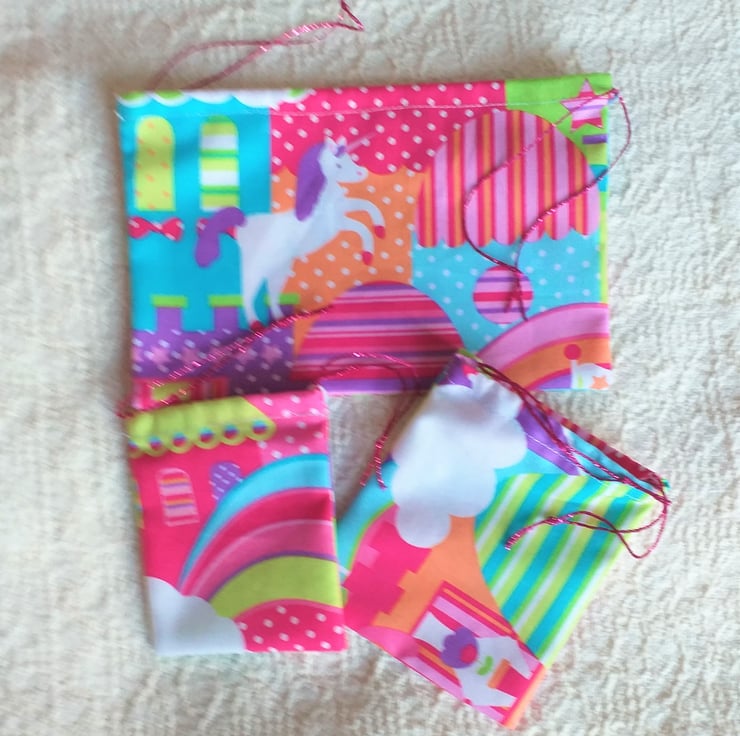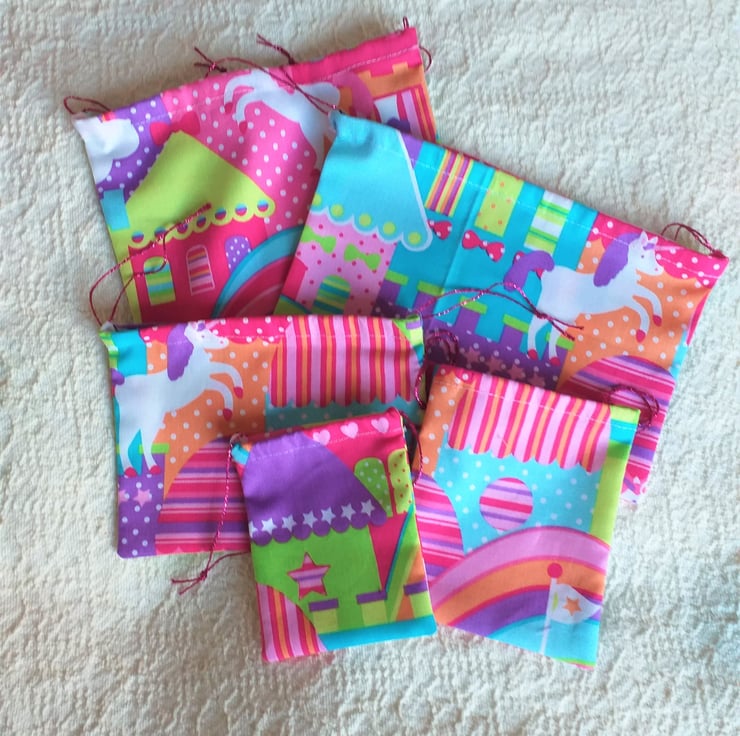 These five gift bags of varying sizes are made from good quality quilting cotton, depicting a vividly colourful fantasy village. Some of them show unicorns, rainbows or hearts. The festive drawstrings are a deep glittery pink. The largest bag measures 6" (15 cm.) by 5.5" (14 cm) and the smallest just 3.5" (9 cm.) by 3" (7.5 cm.). They can be machine washed and re-used.
