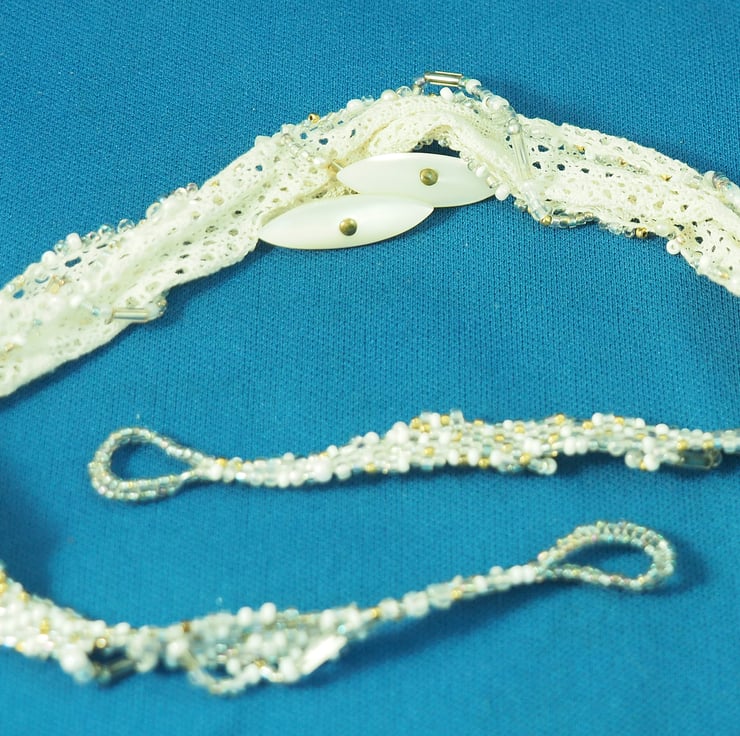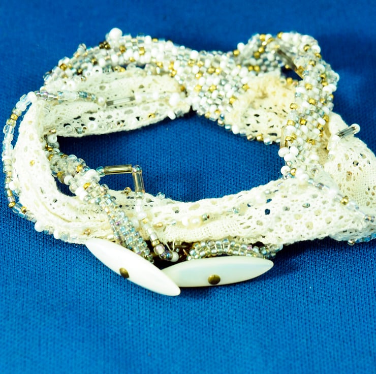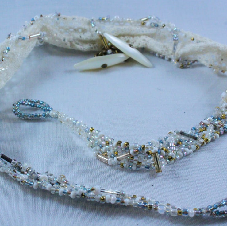 The lace has beads stitched along both edges and strands of beads wound around it, stitched at random points to hold it in place.