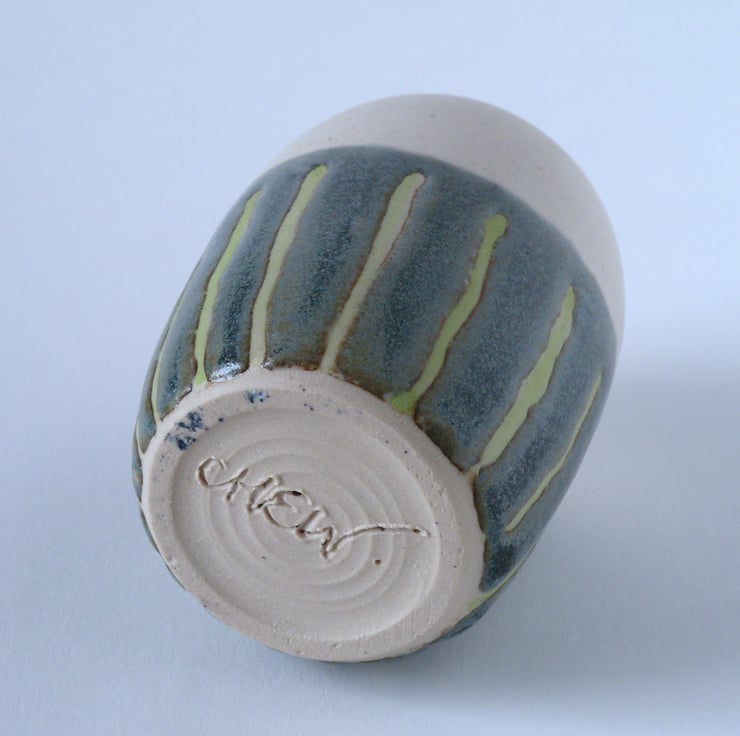 Decorated with a creamy matt glaze with green and grey blue stripes , it complements any interior.