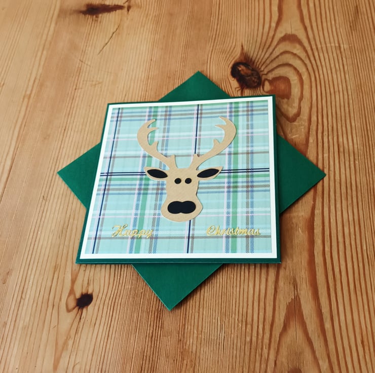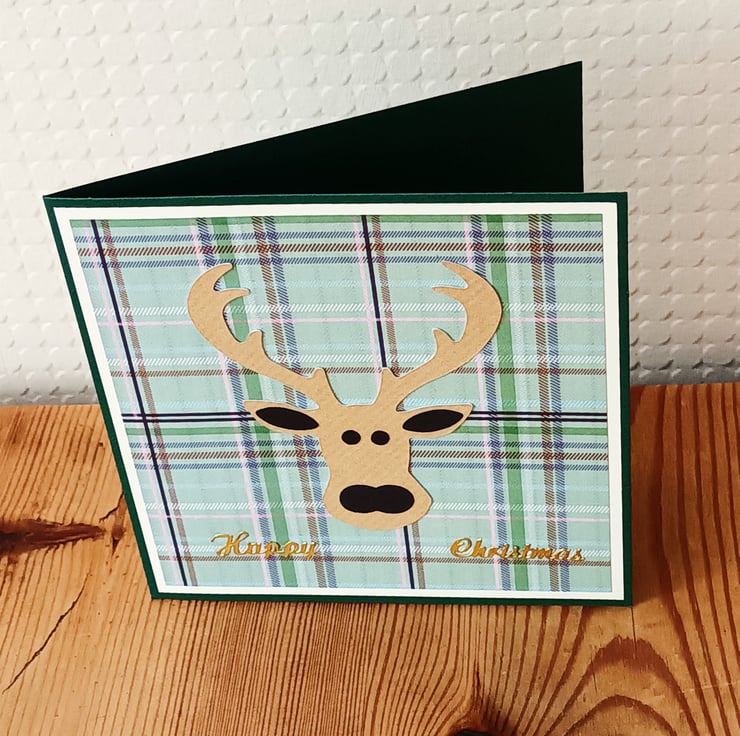 A cute card consisting of a stag head on a background of green tartan paper bordered in cream and finished with “Happy Christmas” in gold letters.