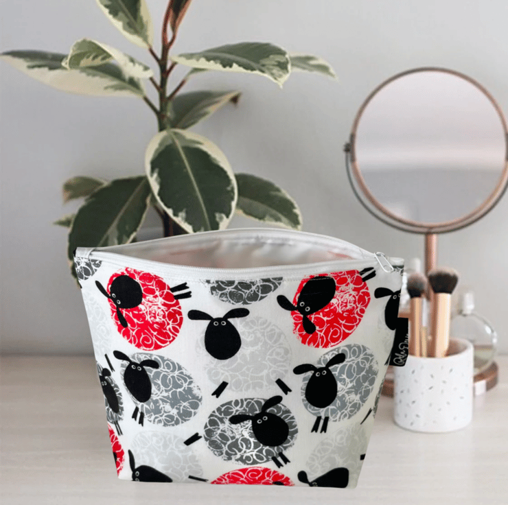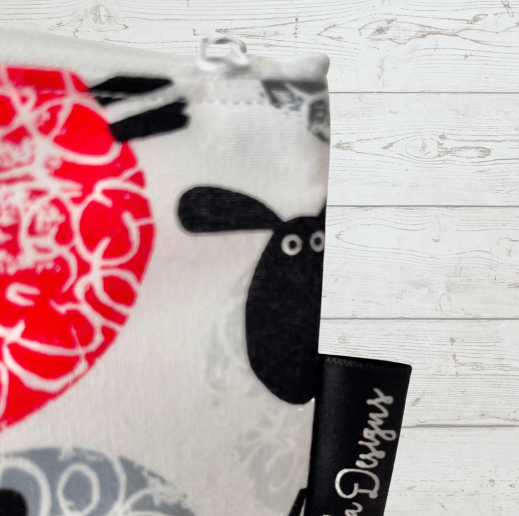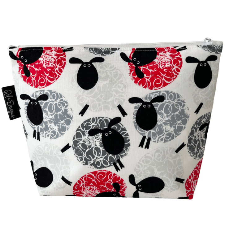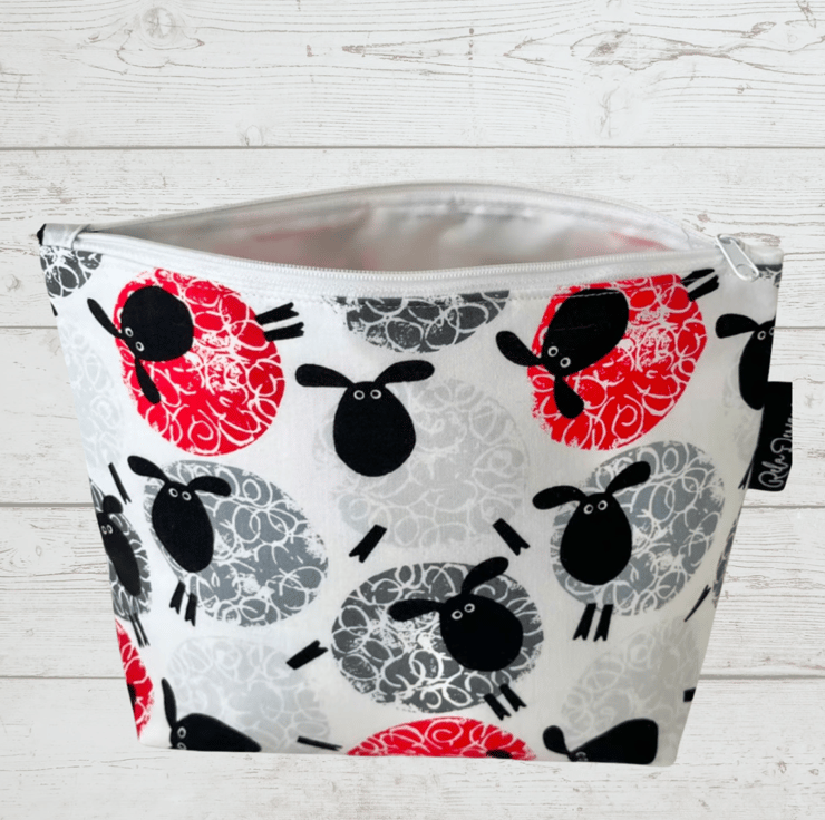 This 100% cotton, sheep and wool themed print pouch has a white waterproof nylon lining , great for those inevitable spills.