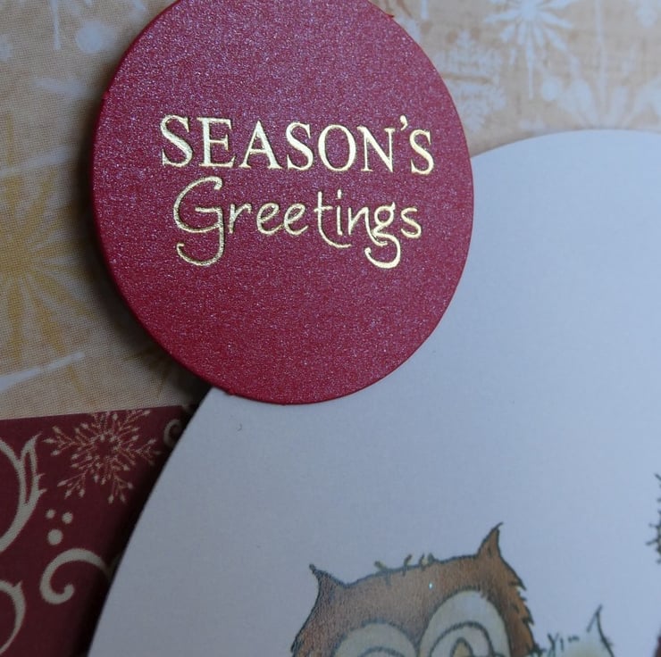 Three red faux pearls and a circular red message with the words Season's Greetings in gold have been added to finish the design. Both the image and the message have been raised from the background on foam pads to add interest and dimension.