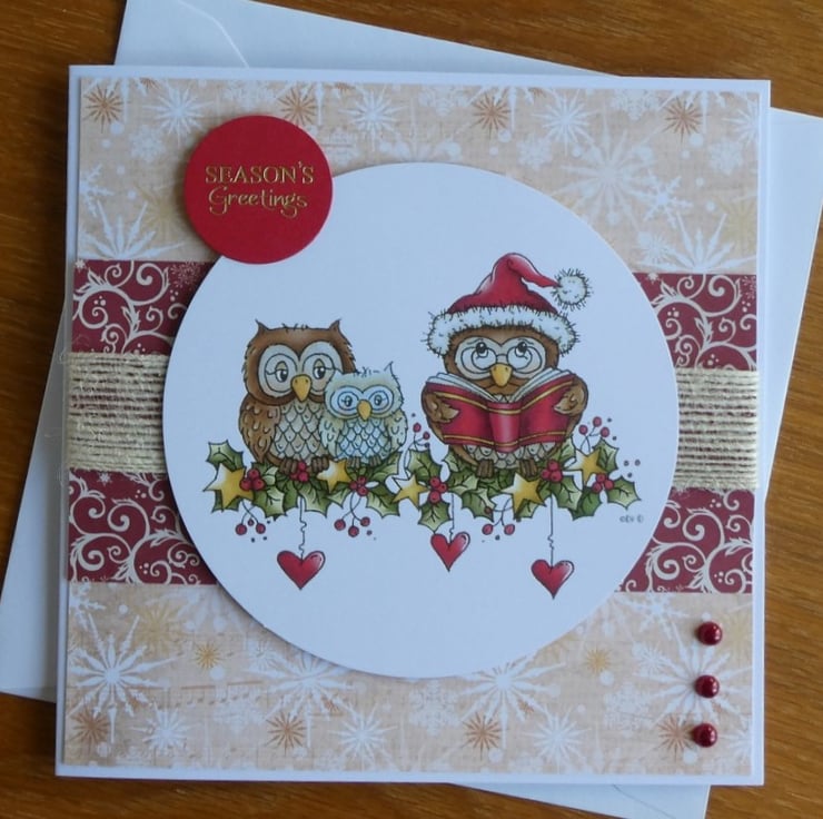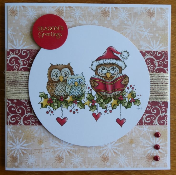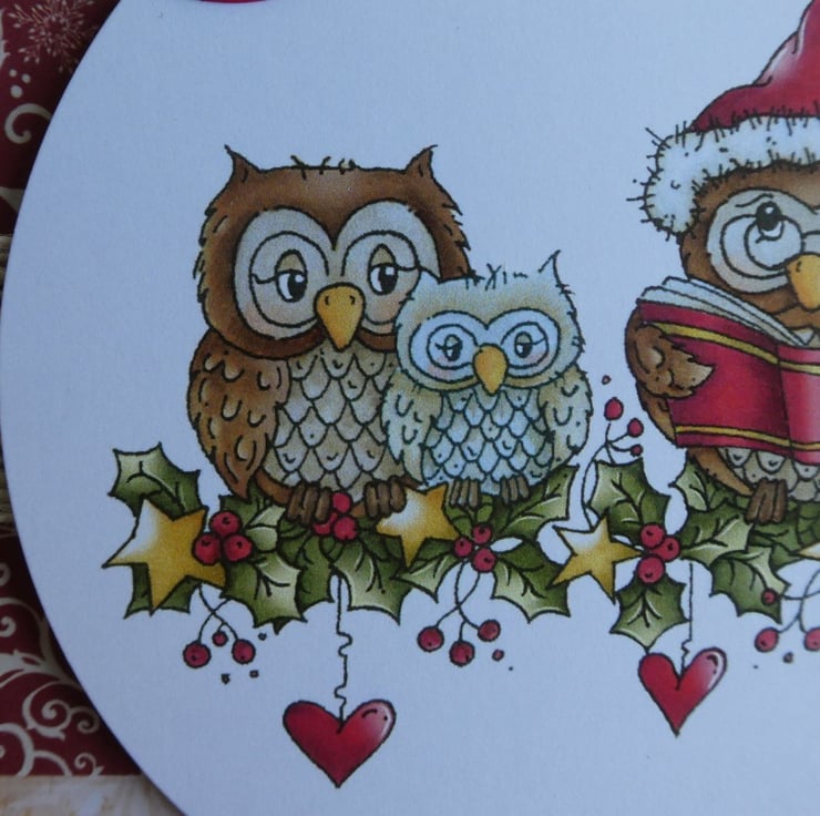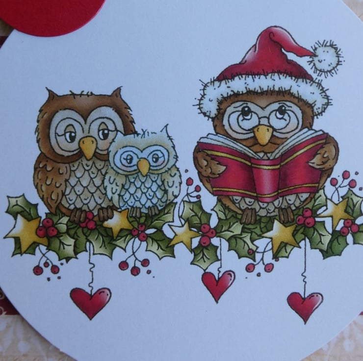 This Christmas card has a printed topper showing an owl wearing a santa hat reading a story to 2 smaller owls, all sitting on a branch covered with holly, stars and hearts.