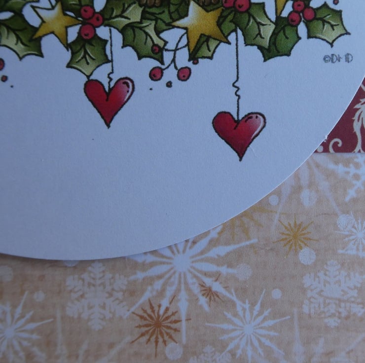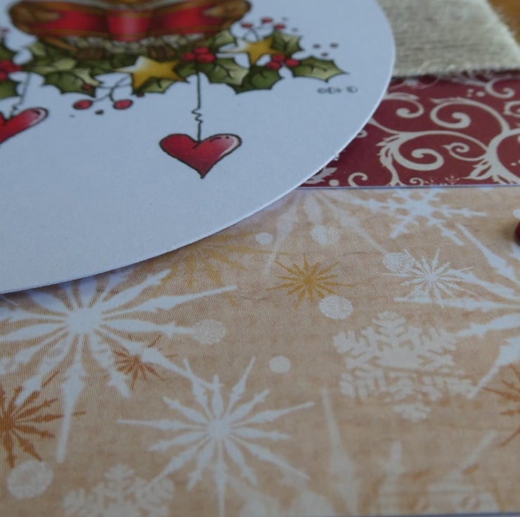 The image has been mounted onto a fawn and white snowflake patterned background which has a strip of red and cream scroll patterned card and a natural jute band across the centre.