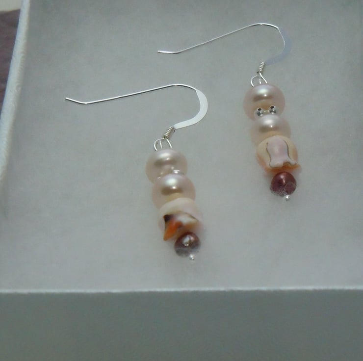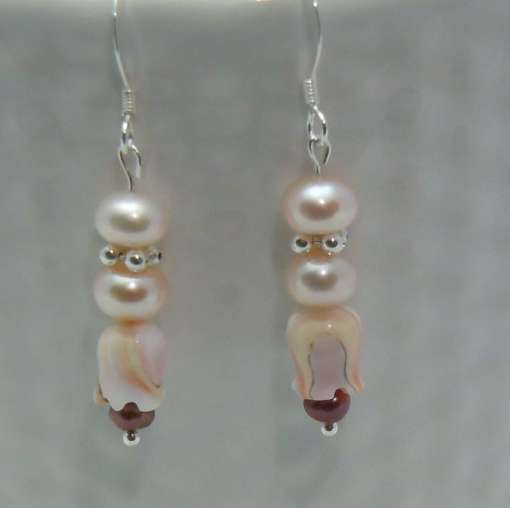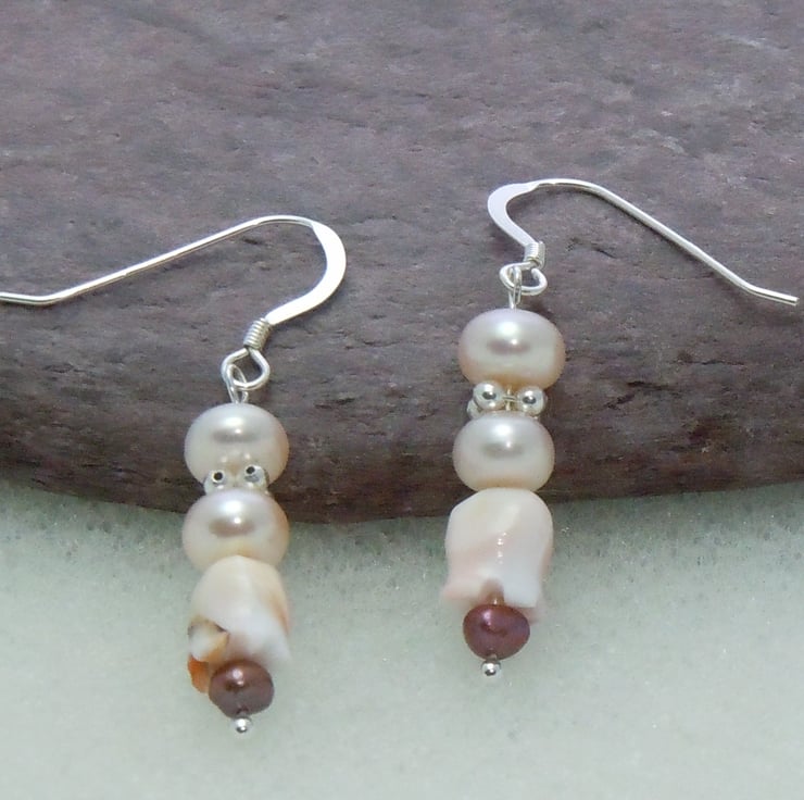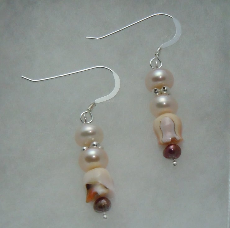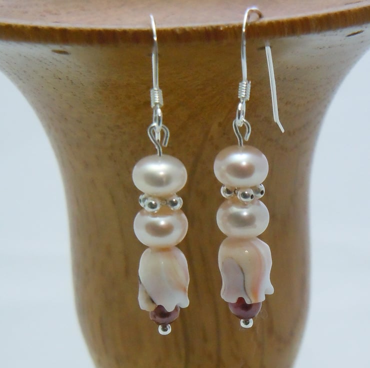 Sterling silver drop earrings with cream freshwater rondelle pearls, small burgundy freshwater pearls & pretty unusual shaped tulip shell beads with sterling silver beads, fittings & earwires. Pearl is a June birthstone.