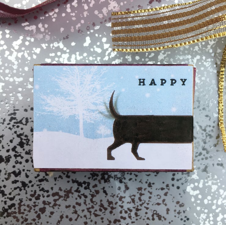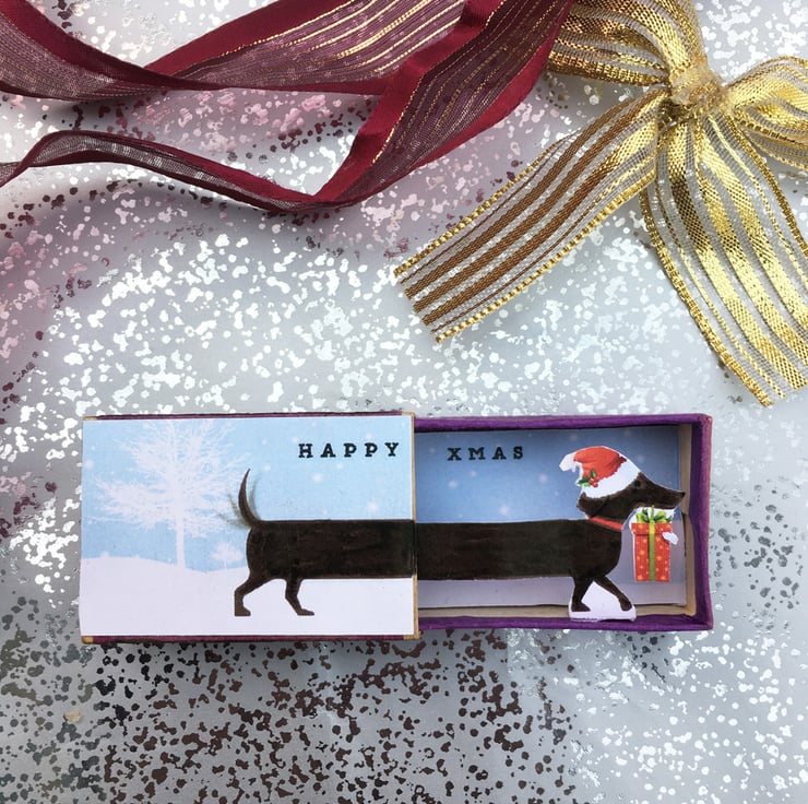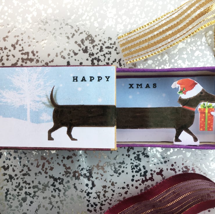 This tiny diorama of a dachshund delivering a present is housed inside a vintage matchbox. I've covered the top label and made the scene inside using colour paper copies backed with card.