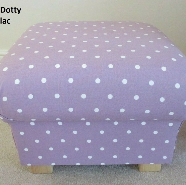 I am a professional upholsterer with over 33 years experience, and have handmade this adult sized STORAGE footstool using Clarke & Clarke Dotty Spot Lilac fabric.