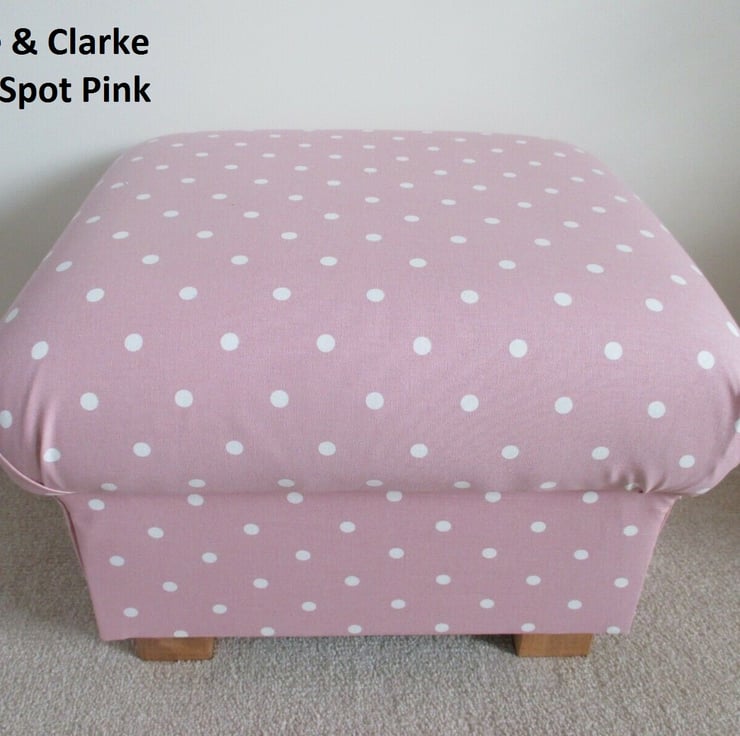 I am a professional upholsterer with over 33 years experience, and have handmade this adult sized STORAGE footstool using Clarke & Clarke Pink Dotty Spot fabric.