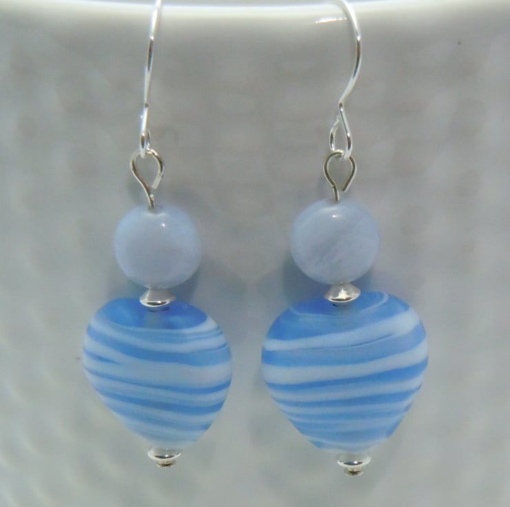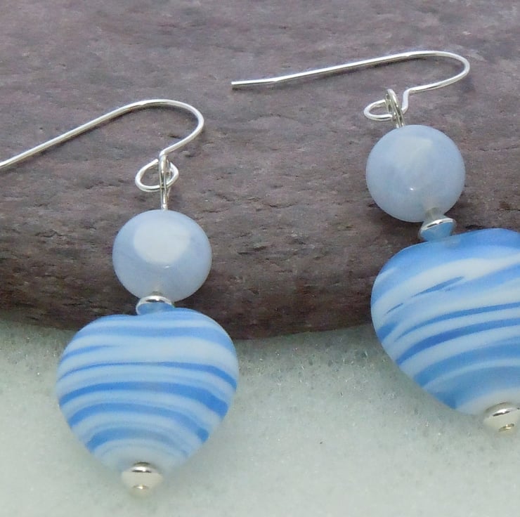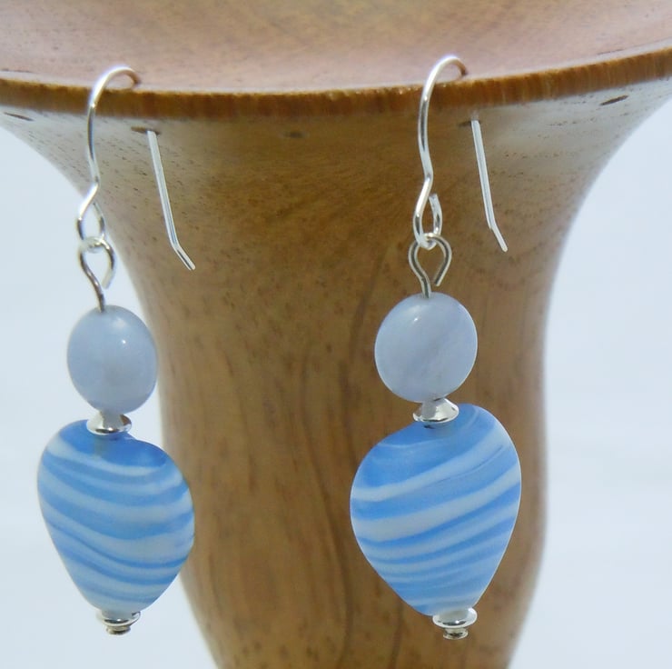 Earrings with lovely heart shaped puffed blue striped Lampwork beads & blue lace Agate coin beads with Sterling silver beads, fittings & earwires.