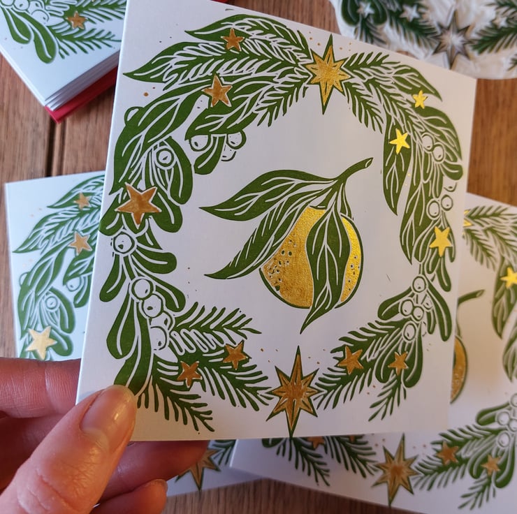 Each card is printed using a lino block in a rich leafy green, then hand painted with shimmery gold ink. It catches the light beautifully!
