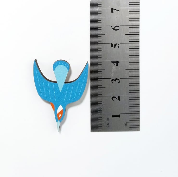 The kingfisher measures approx 30mm across the wingspan and 40mm from tip of beak to end of tail, thickness of badge is 4mm. The pin on the back is a metal butterfly clutch pin.