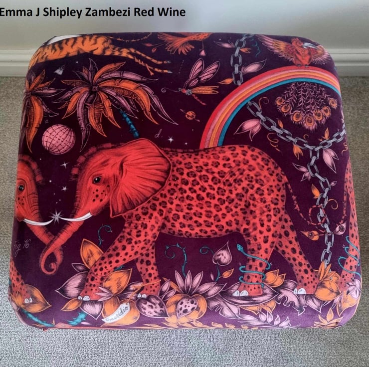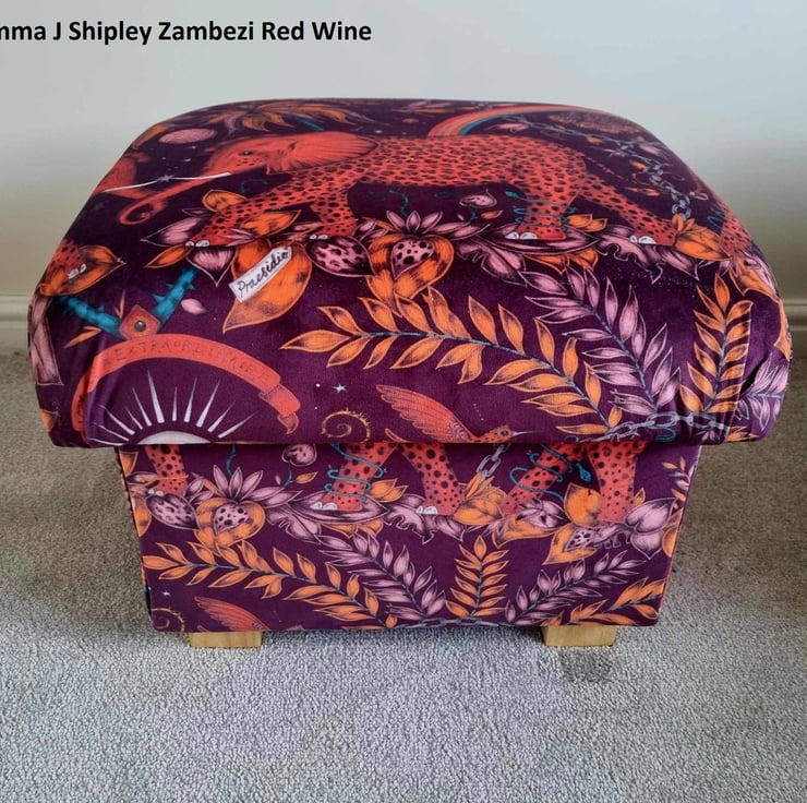 I am a professional upholsterer with over 33 years experience, and have handmade this adult sized STORAGE footstool using Emma J Shipley Zambezi Red Wine fabric.