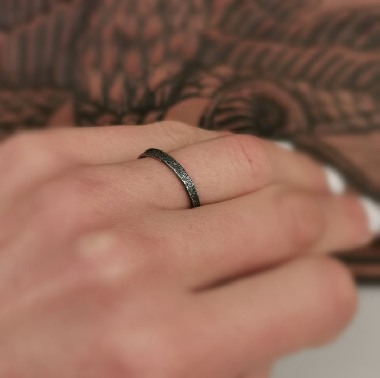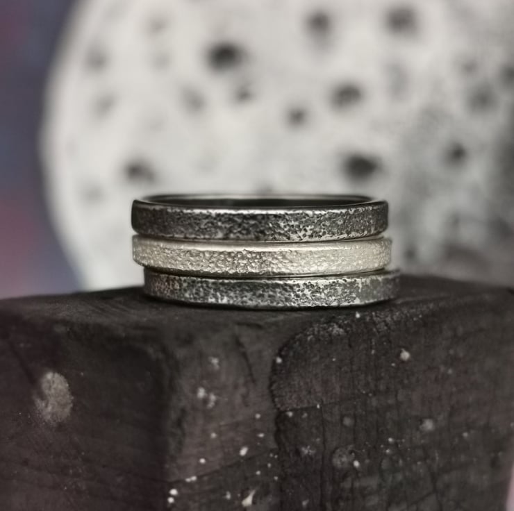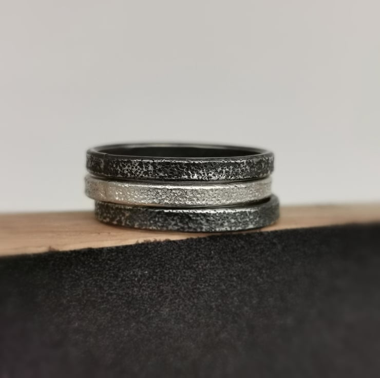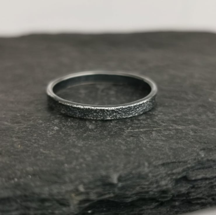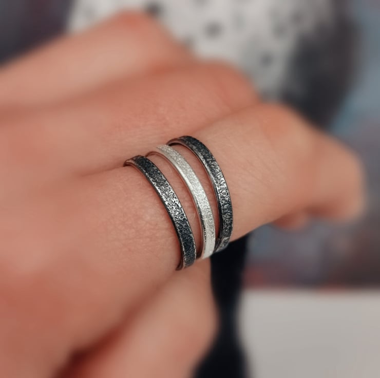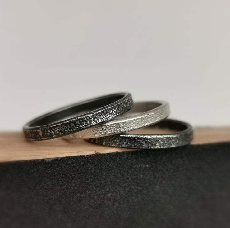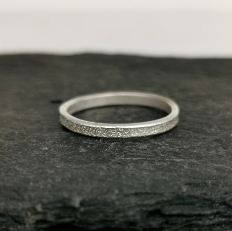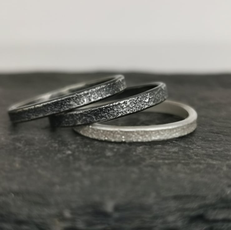 Each band is 2mm wide and textured with a sandblasted or stardust effect.