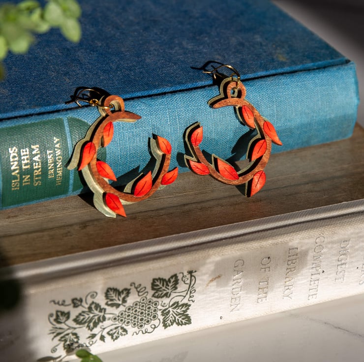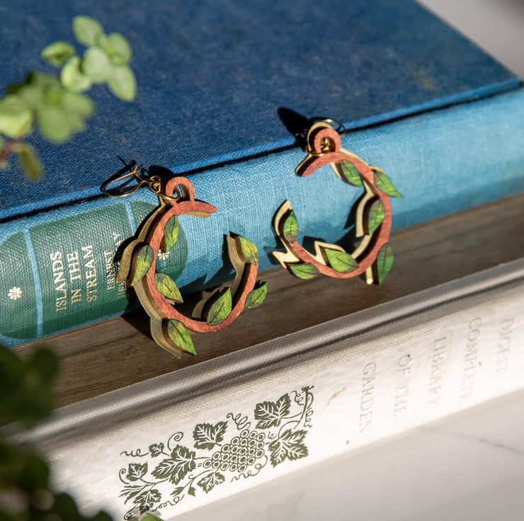 Bring the beauty of nature to your everyday look with these stunning laser cut wooden wreath earrings, delicately hand-painted in rich earthy tones, with a layer of hand cut brass to catch the light and add some sparkle. Inspired by leafy vines and seasonal foliage, these earrings are crafted from sustainably sourced wood and finished with gold-filled hooks – perfect for sensitive ears.