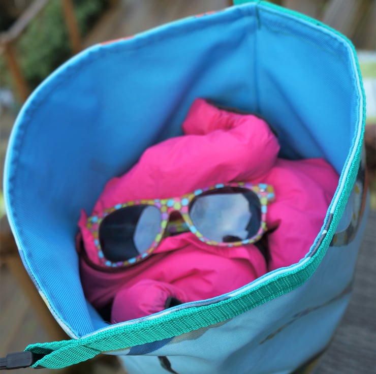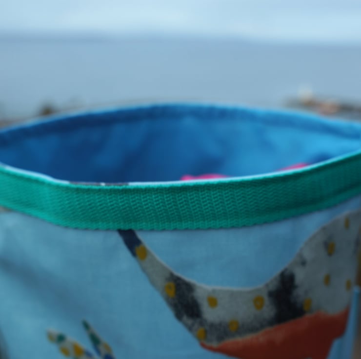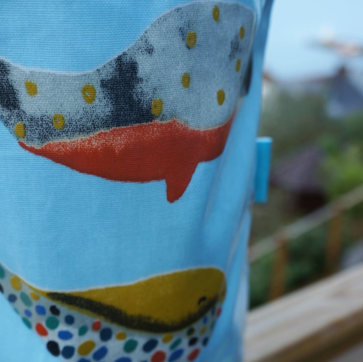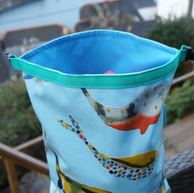 This delightful vibrant bag is highly practical due to its roomy size, it is slightly larger than my other toiletry bags. It has a useful clasp handle and is bjased on a traditional dry bag, it is a matter of fill her up, then fold the top down, and voila! - a waterproof, easy to carry and to hang-up wash or lunch bag . It will stand up for itself due to its sturdy base. The fabric is made from quality shiny oilcloth in a jolly vibrant design, the inside lining made with a showerproof pvc in contrasting royal blue.