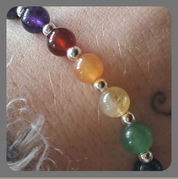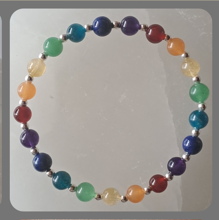 Elasticated Chakra bracelet made with 7 different coloured gemstones stones and sterling silver beads.