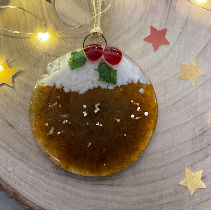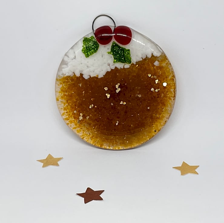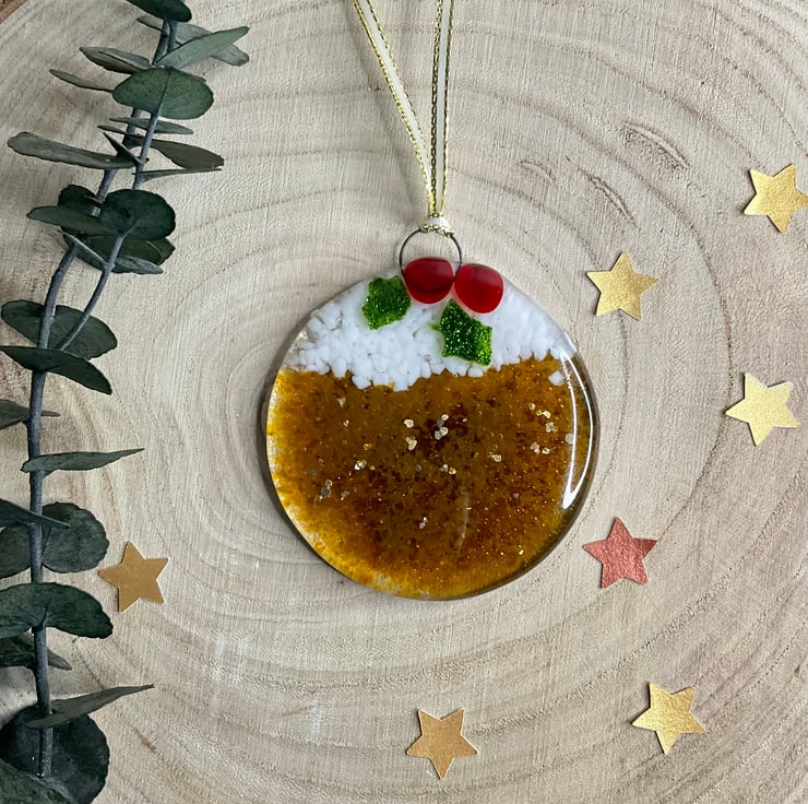 Christmas decoration this is a handmade fused glass Christmas pudding. It is hand cut from bullseye art glass in a circular shape. Each pudding has a mixed brown section with gold flecks and a white icing area, topped with a red berry and glittery holly leaf. Each pudding has a metal hanging ring with a gold and white ribbon for hanging.