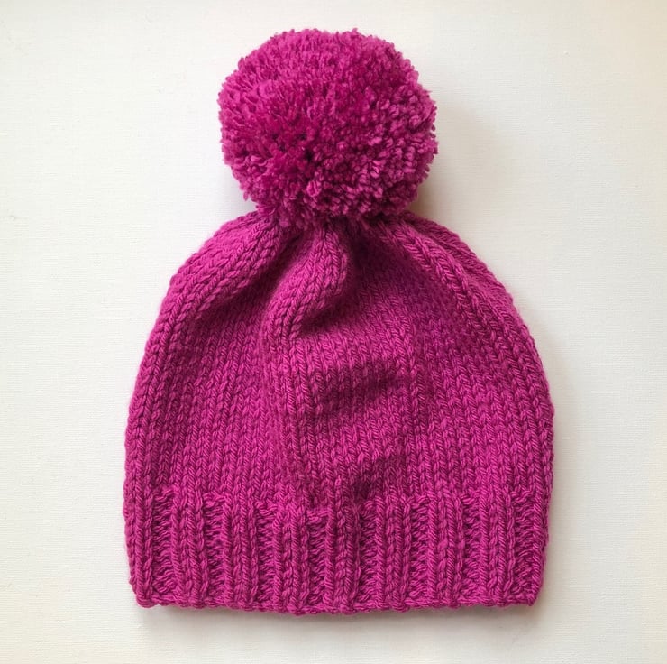 This bobble hat is hand knitted in a pink chunky acrylic yarn with a large pink chunky and squishy pom pom sewn on.