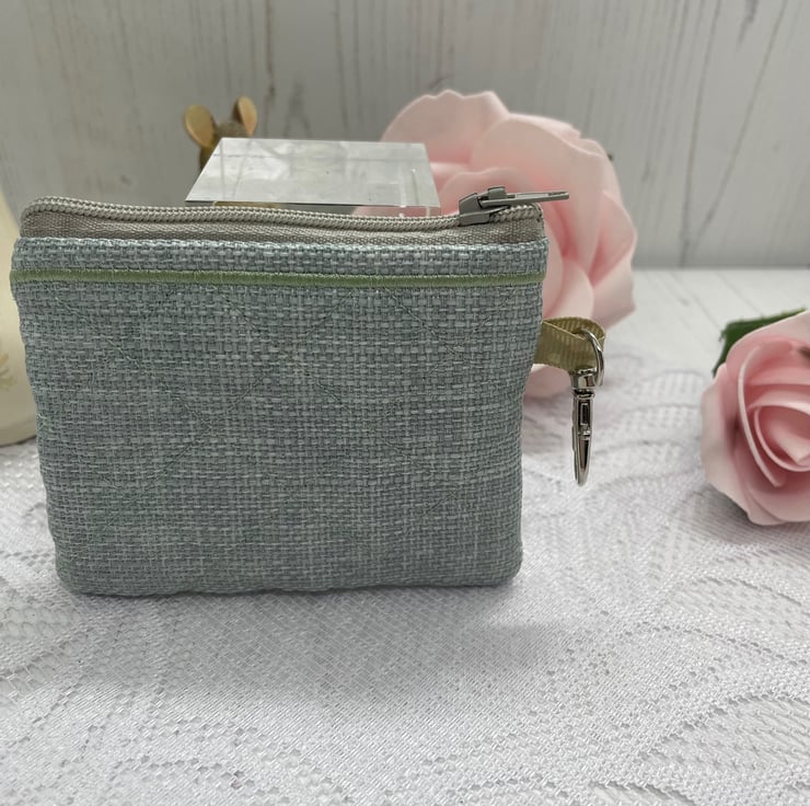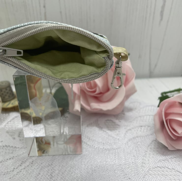 Pretty panda design stitched onto linen look cotton. Quilting design on the purse front and back. Lined with green cotton. Zip closure with a ribbon and lobster clasp tag to the side. Ideal for loose change.