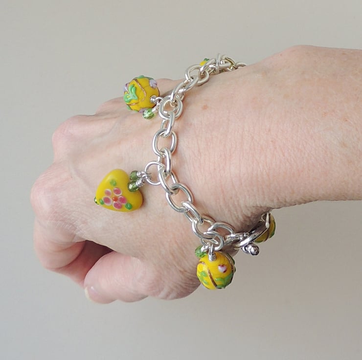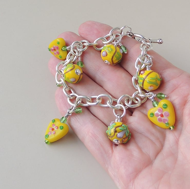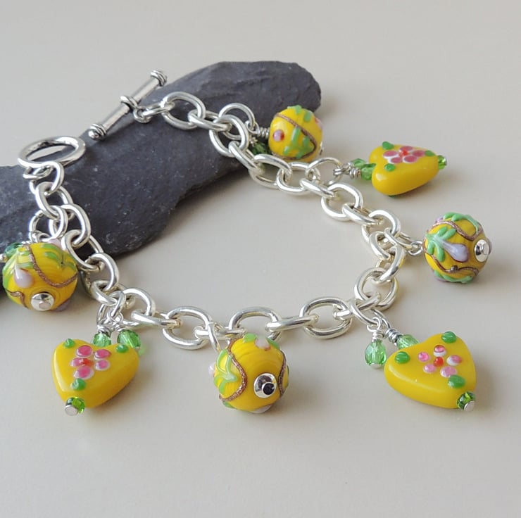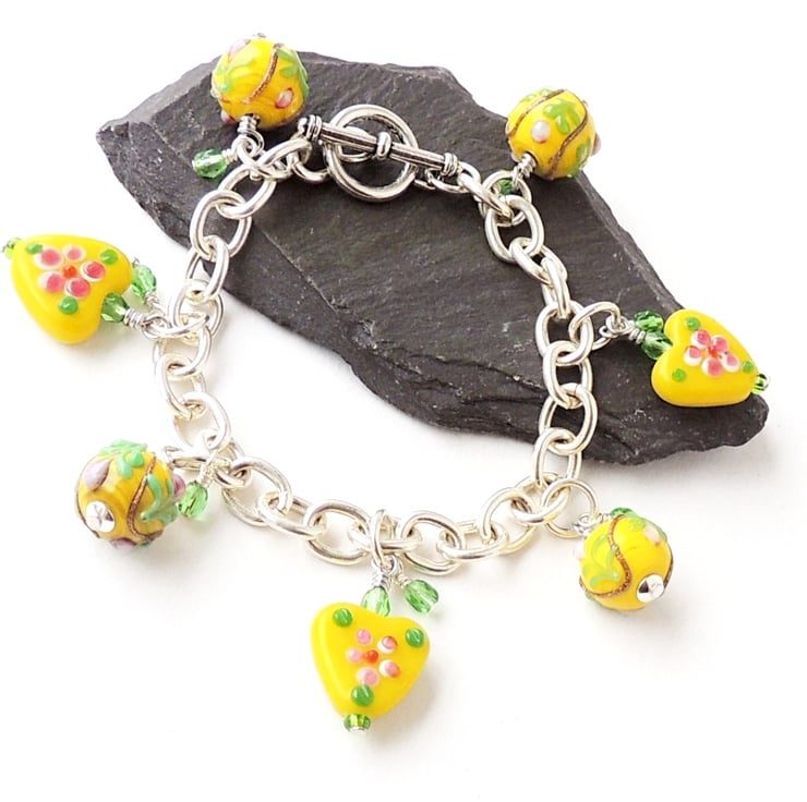 This yellow bracelet has yellow glass hearts and beads on a silver plated bracelet.