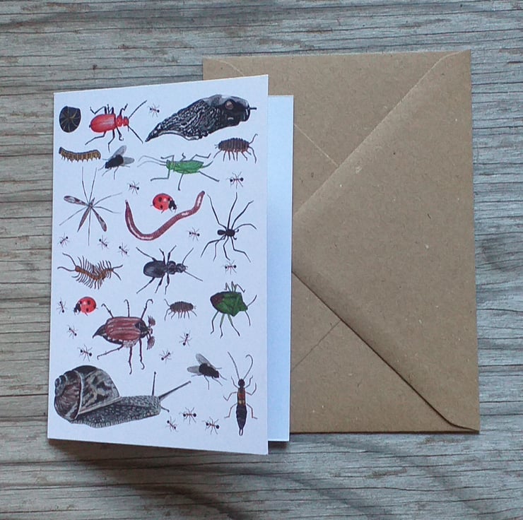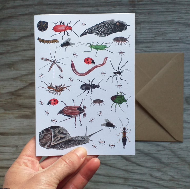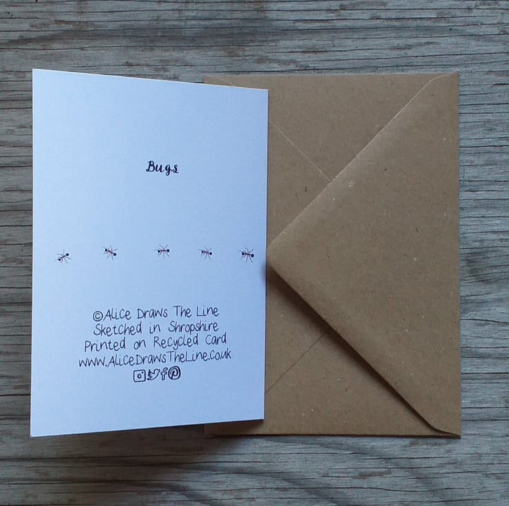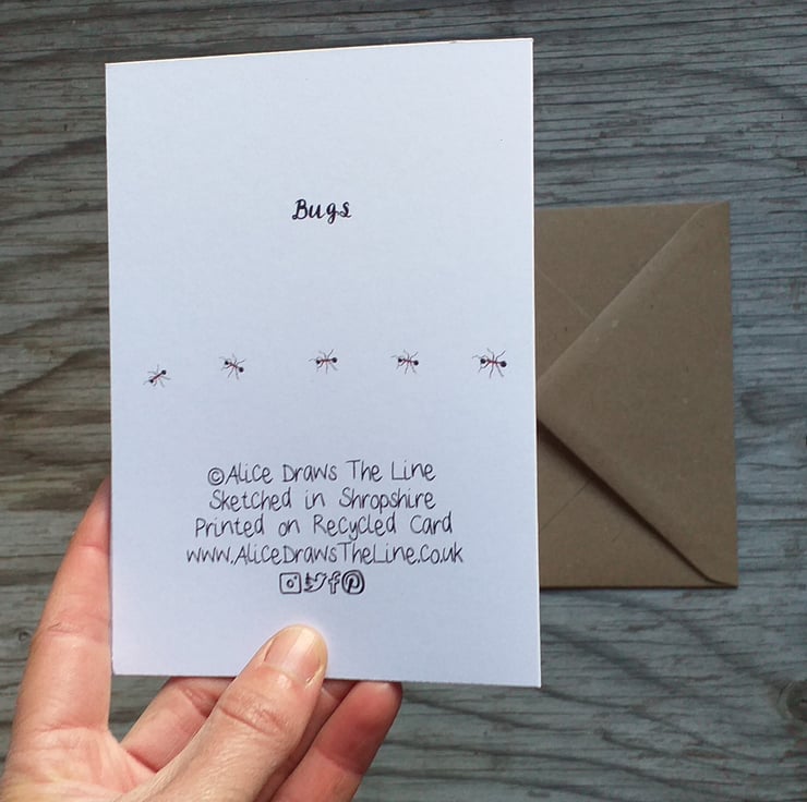 Alice spent twelve years teaching children, young people and adults in woodland settings. Children's love of bugs of all varieties has inspired this card and the bug mugs that are available in both enamel or China