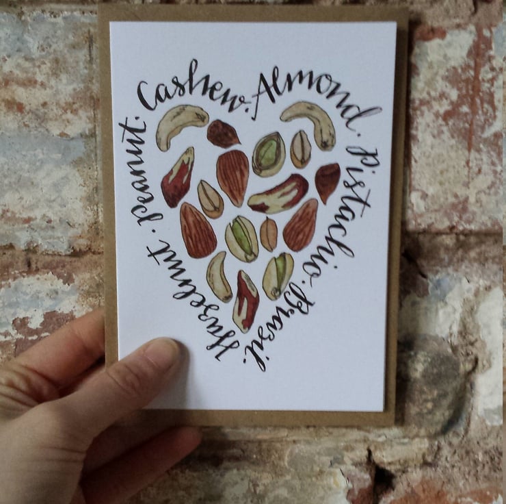 Nuts about You! card with Hand Lettering and Illustration has been created from an original drawing by Alice Draws The Line. This card features illustrations of cashew nuts, almonds, pistachios, brazil nuts, hazelnuts and peanuts.