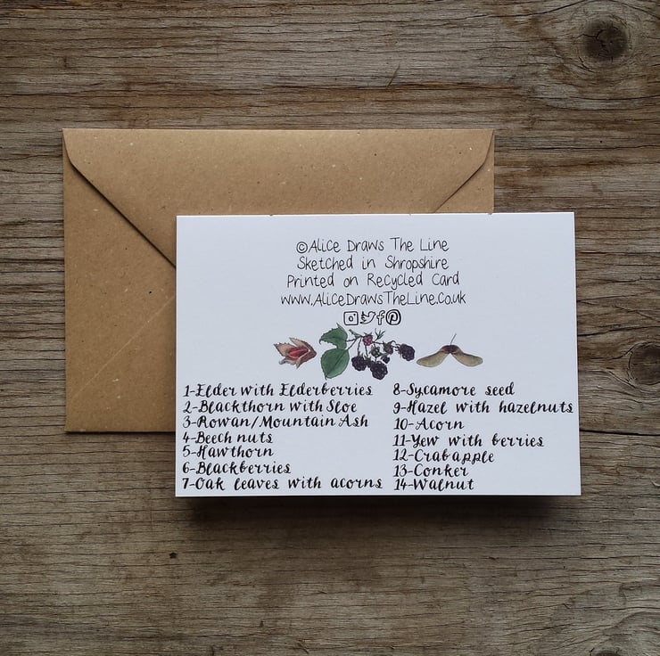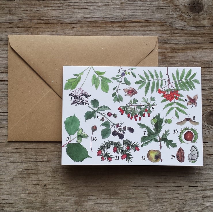 This tree-mendous(!) card celebrates the many drawings Alice has done through late summer and autumn, with modern botanical illustrations of forest finds. Each one is numbered and the species is identified on the back of the card... doubling up as a fun quiz for those with an interest in tree identification (with a blackberry thrown in too!).