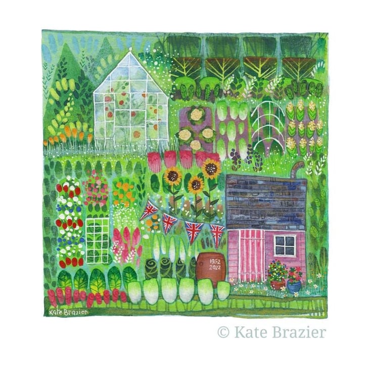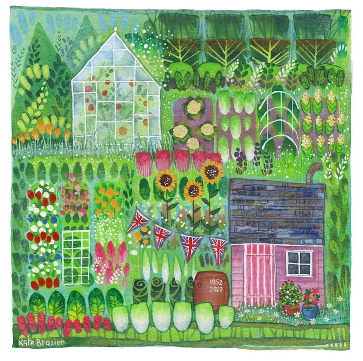 Marj and Merv are very proud of their allotment. They spend all their evenings and weekends at their plot, companionably sowing seeds, potting on their seedlings and drinking tea. Marj has been sewing Jubilee bunting all ready for the Queen's Platinum Jubilee in June. She and Merv love the Queen. They will be having a little garden party in her honour. There will be egg and cress sandwiches, a Victoria sponge and lots of tea. Of course.