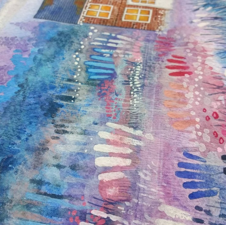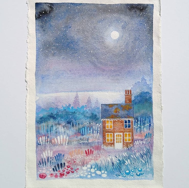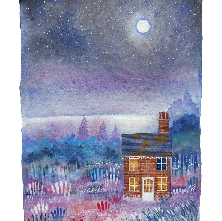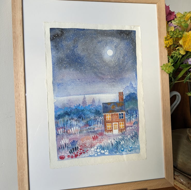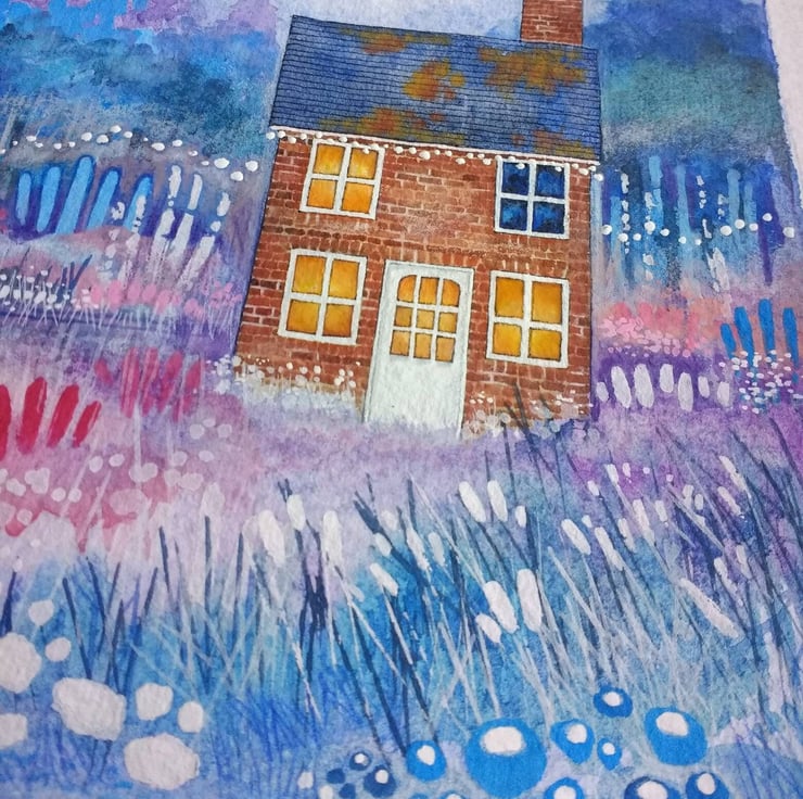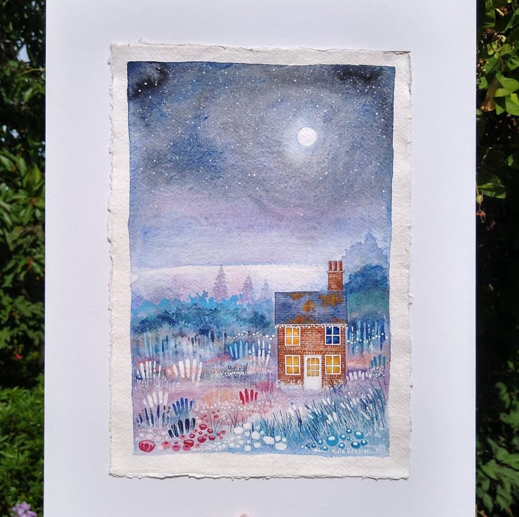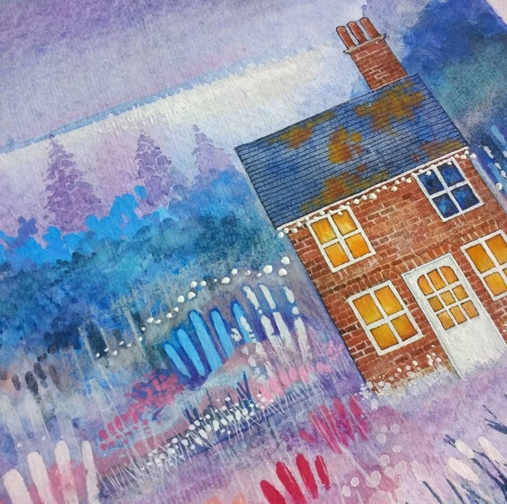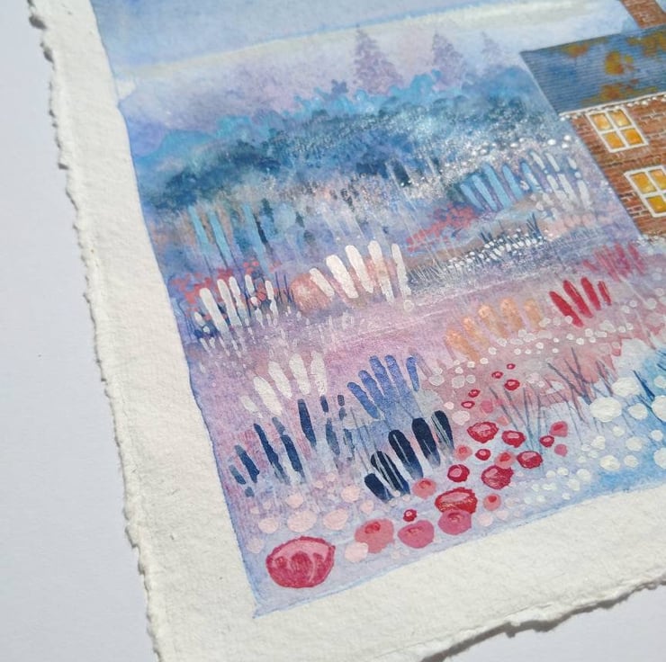 'Misty Cottage' is painted using a mixture of watercolour, gouache and water soluble pencil on handmade Khadi paper. The edges of the paper have been left clear of the mount in a floating style to show the beautiful deckle edges. Please note that due to the nature of the paper it is not completely uniform in size and shape.