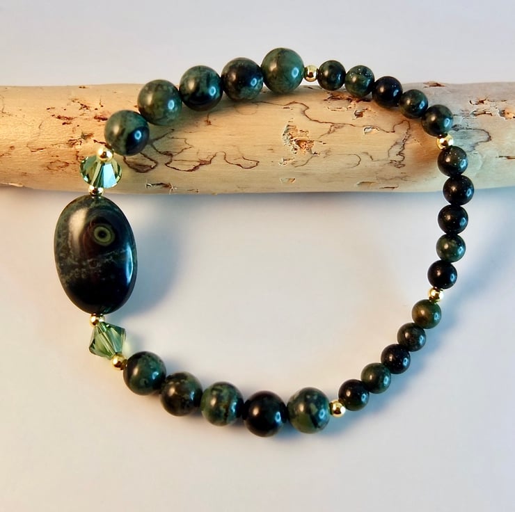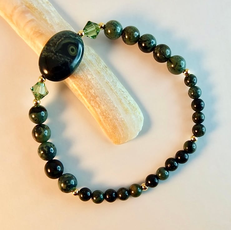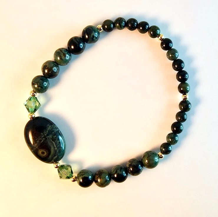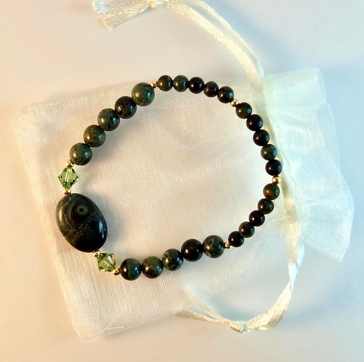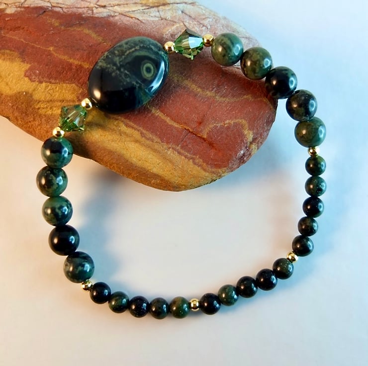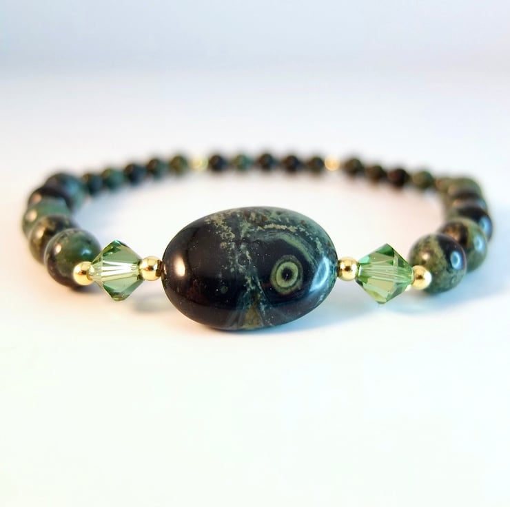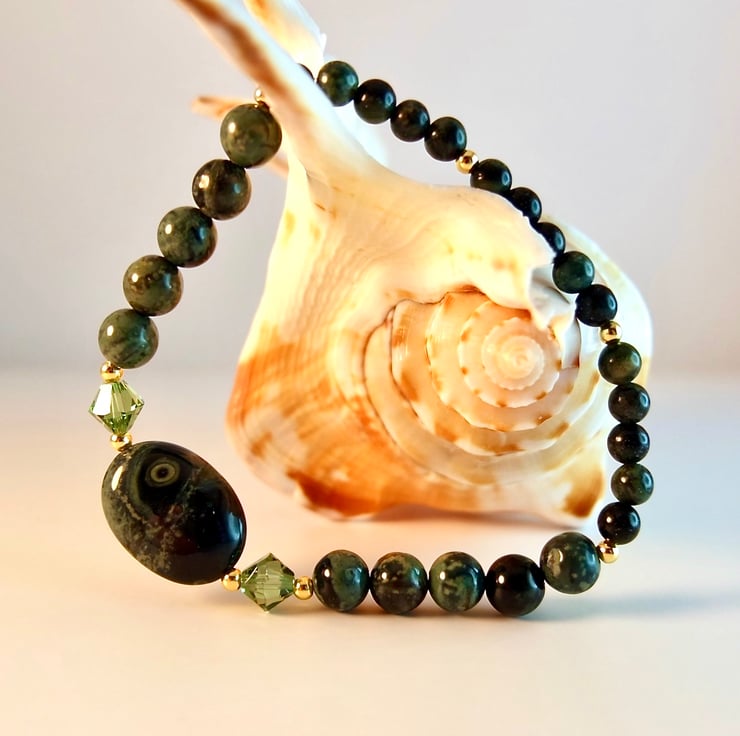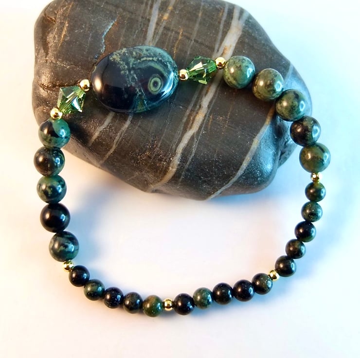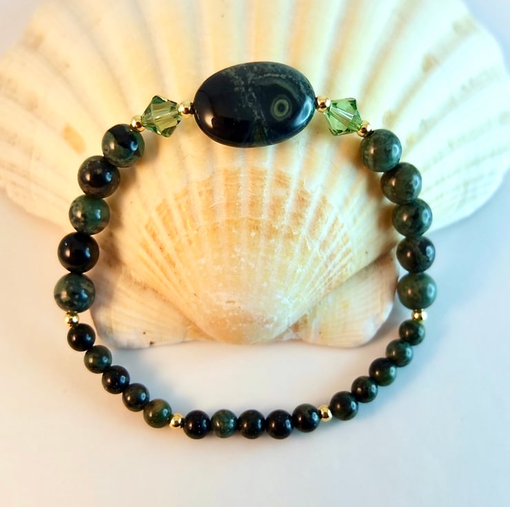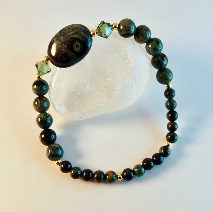 This bracelet is made using different sizes of Kambaba Jasper beads, a unique green and black stone of volcanic origin with fascinating swirling patterns and 'eyes'.
